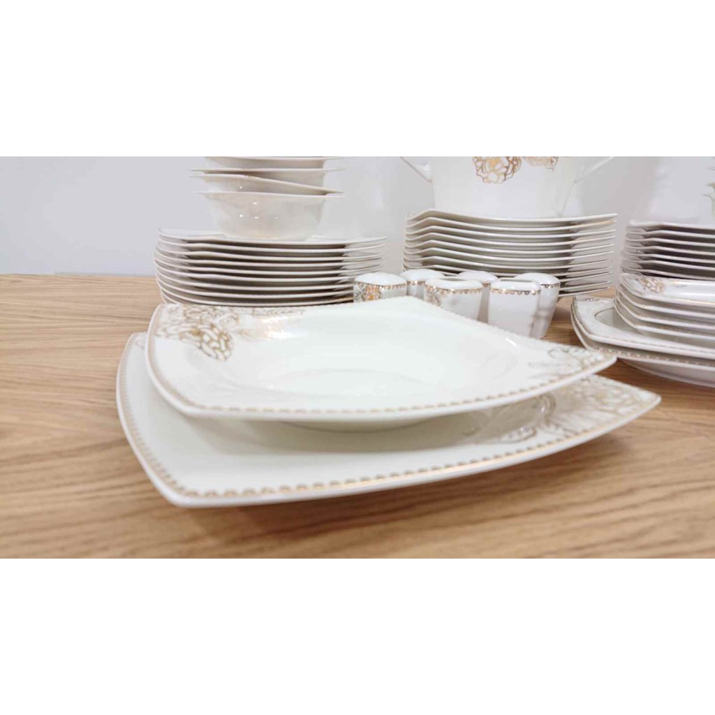 Obsahuje: 1x mísa na polévku 25 x 25 x 10 cm, 12x talíř 27 x 27 x 2 cm, 12x talíř 23 x 23 x 2 cm, 11x dezertní talíř 21 x 21 x 2 cm, 12x mísa 15 x 15 x 5 cm, 4x podnos 24 x 24 x 2 cm, 2x velký podnos 28 x 28 x 2 cm, 2x slánka, 2x pepřenka, 2x dóza na párátka.