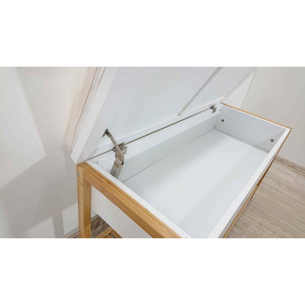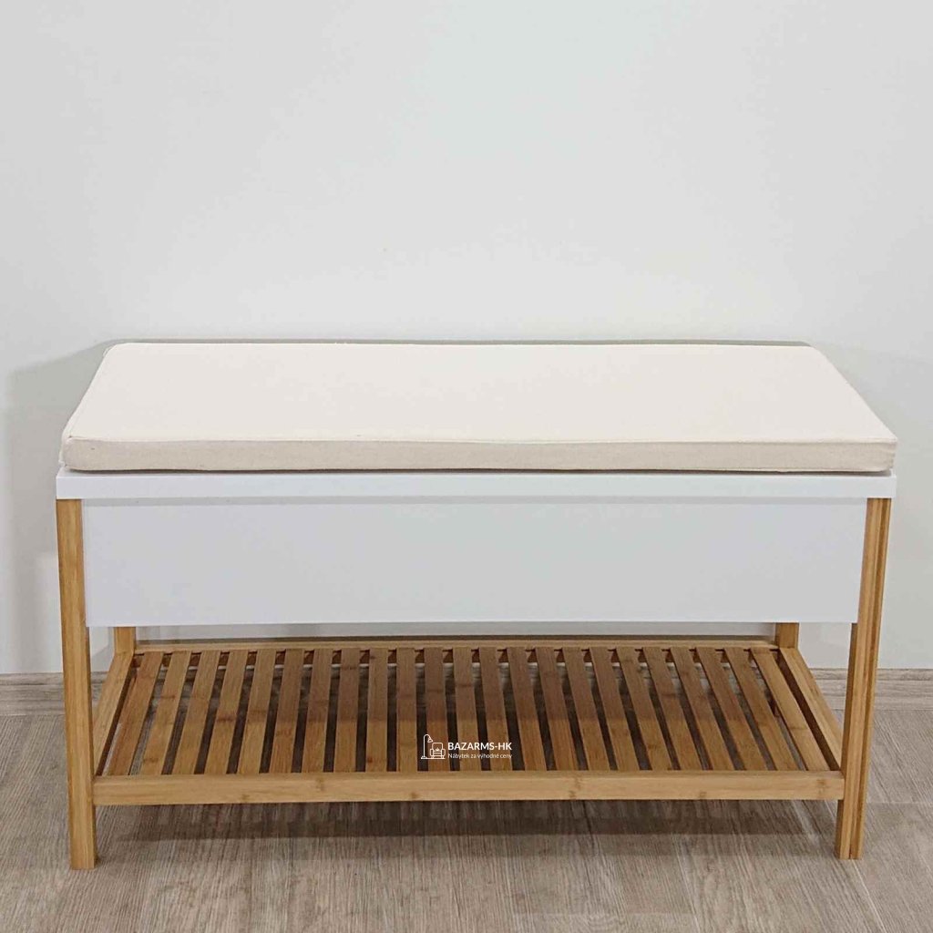 Krásná lavice s úložným prostorem s bambusovou konstrukcí skvěle ladí s moderním a skandi stylem bydlení. Využijete ji nejen v předsíni, ale jistě si najde své místo i v ložnici před postelí na odkládání věcí.