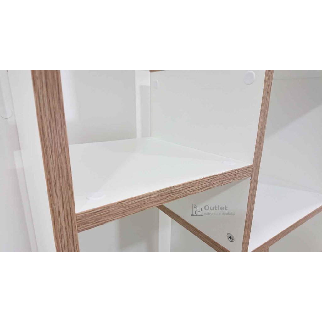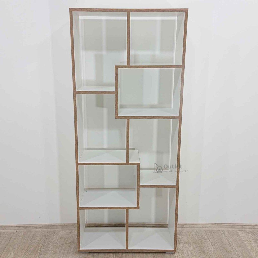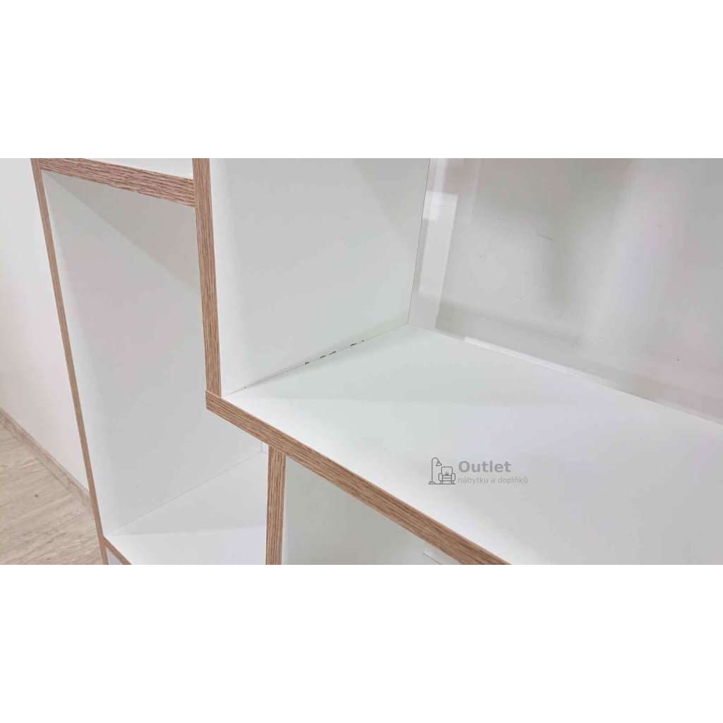 Designová knihovna v bílé barvě s hranami v dekoru dřeva na knížky i dekorace a suvenýry.