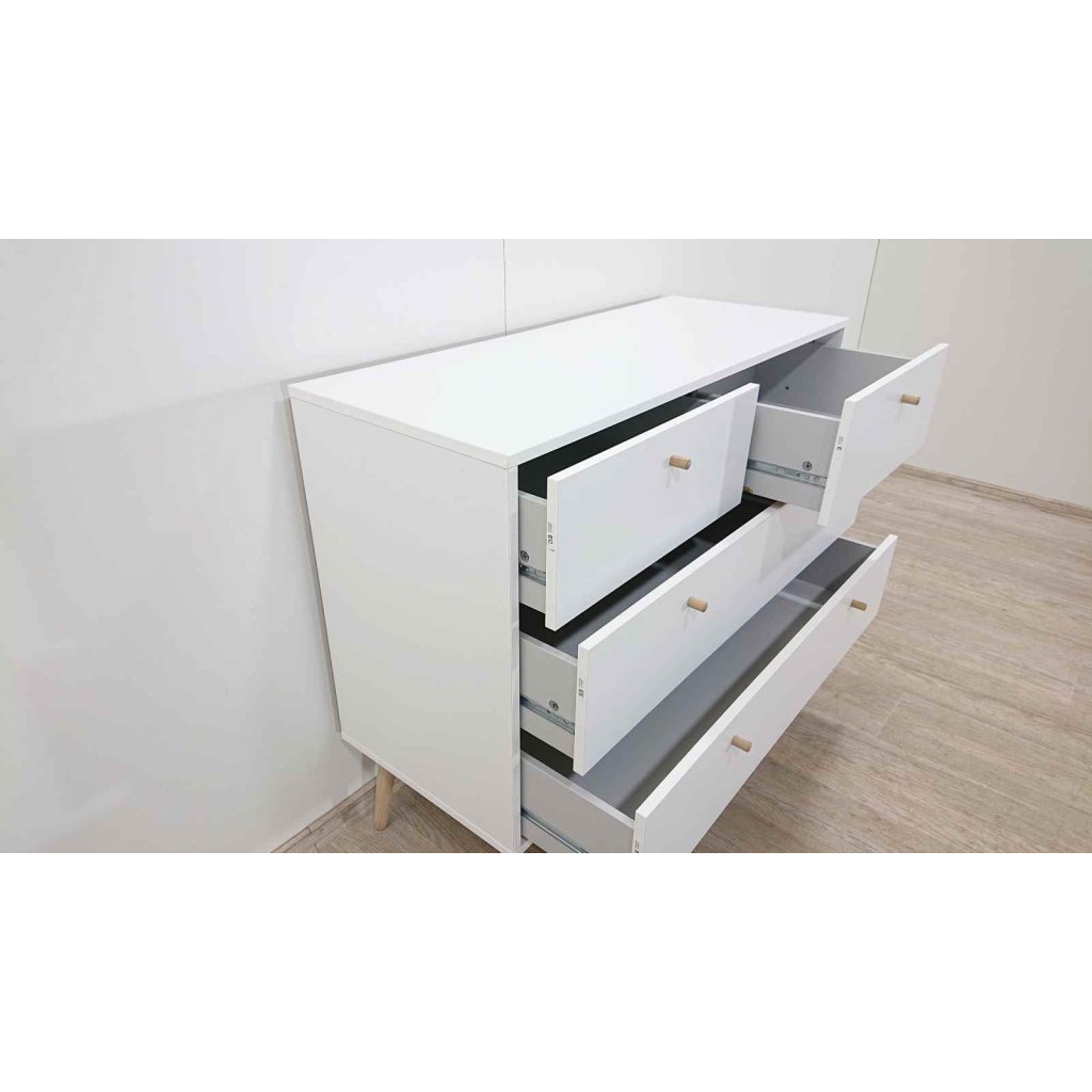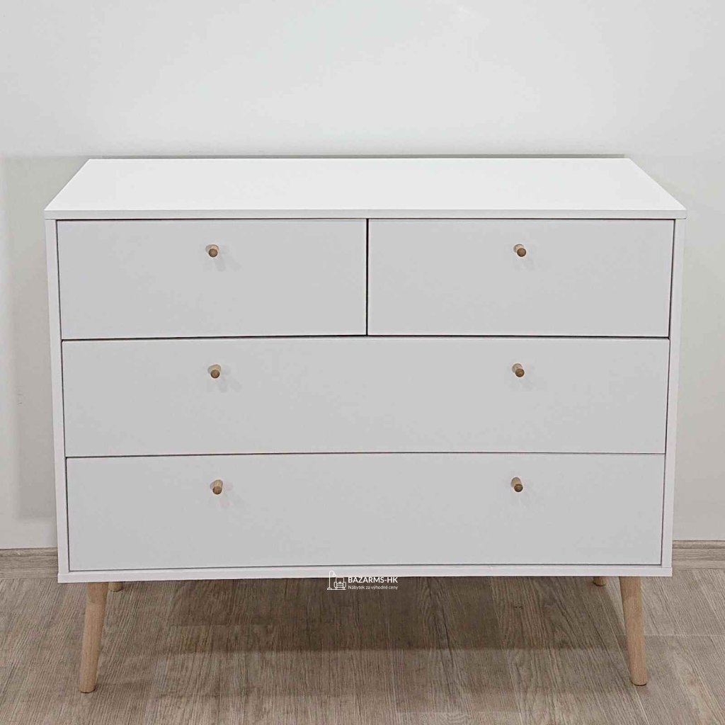 Bílá šuplíková komoda vhodná na oblečení i doplňky. Umístit ji můžete do ložnice, obýváku i do dětského pokoje. Bílá barva doplněná o přírodní dřevěné úchytky a nožky působí čistým dojmem. Tato komoda ladí s moderním, skandinávským i venkovským stylem bydlení.