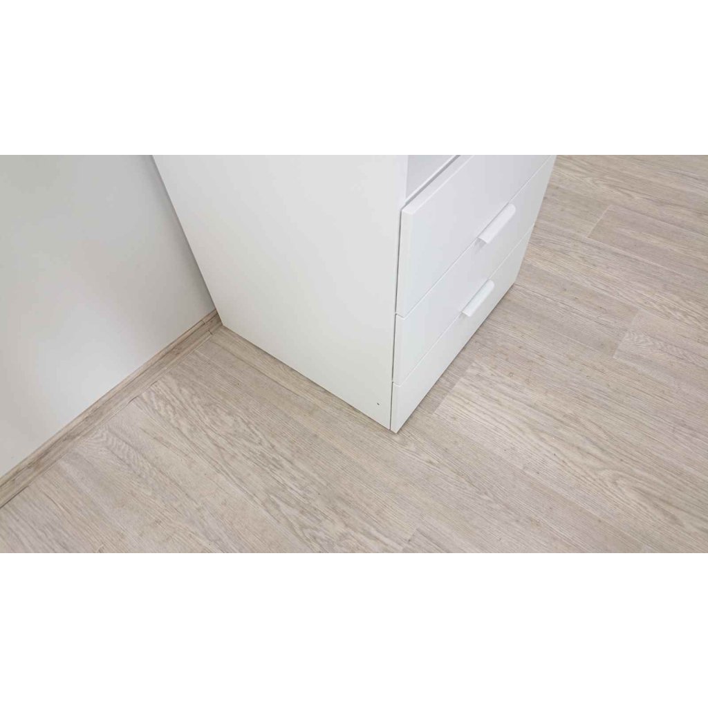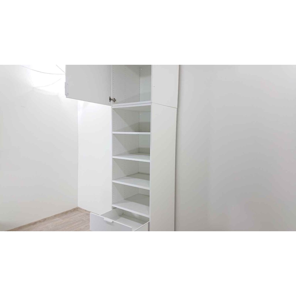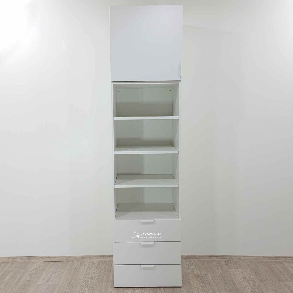 Bílá skříň s policemi a zásuvkami Platsa Ikea.