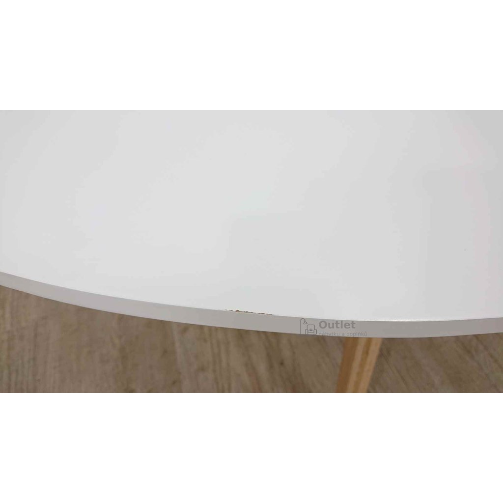 Odkládací stolek s bílou deskou a dřevěnými nohami. Tento jednoduchý konferenční stolek umístěte před pohovku, abyste měli po ruce svůj oblíbený drink, kávu i knížku. Jeho deska je dostatečně prostorná, takže se na stolek vejde pohoštění, ale i noviny a dekorace.