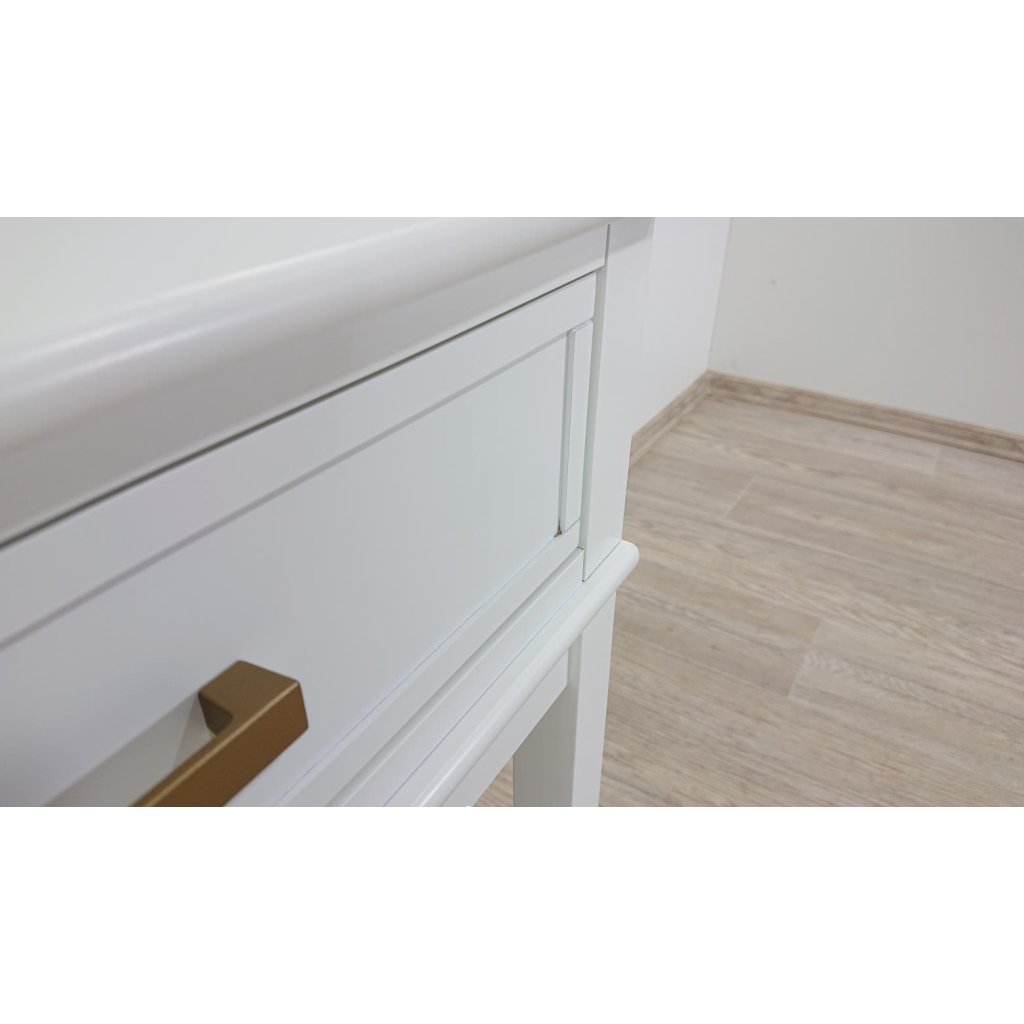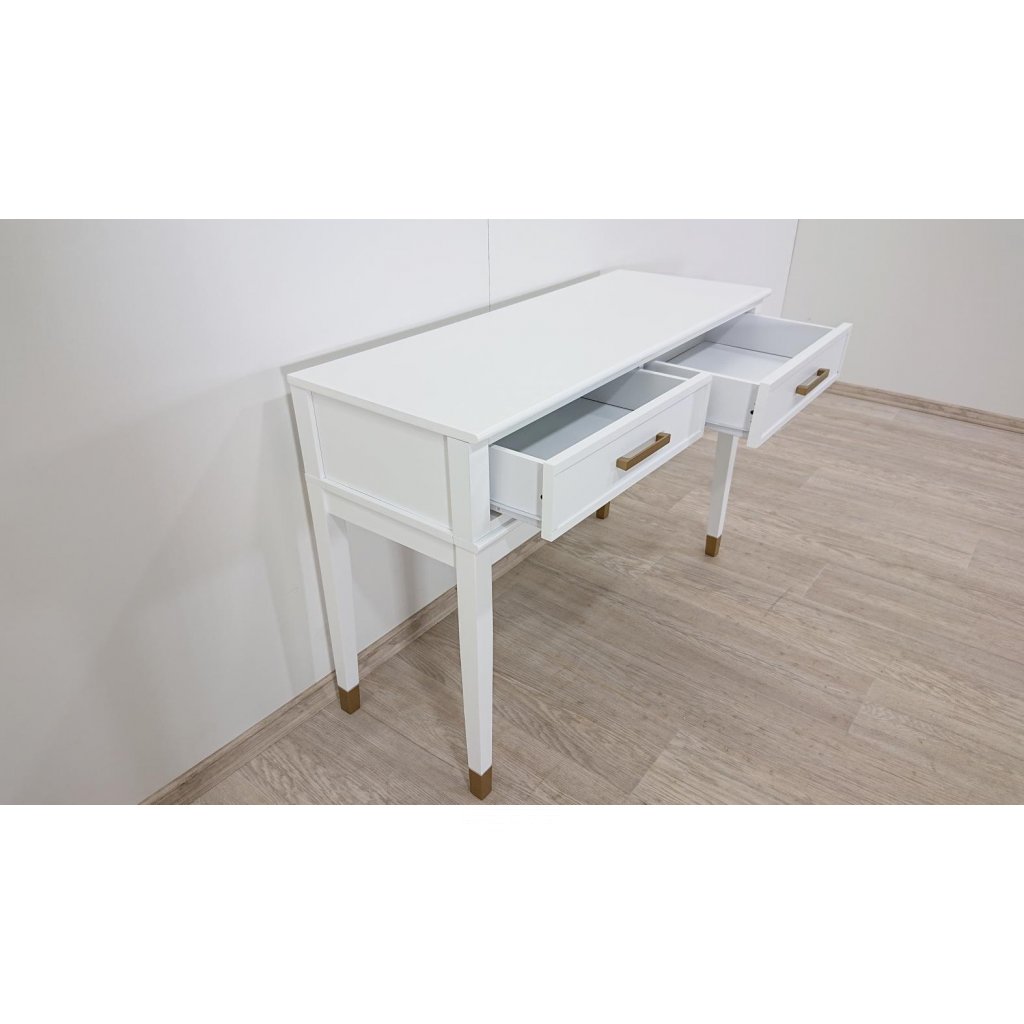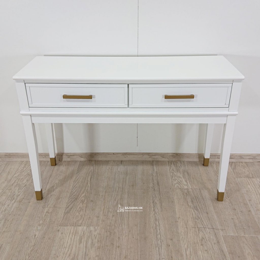 Elegantní bílý odkládací stolek se zásuvkami se zlatými detaily, který využijete v ložnici na líčení nebo v obýváku na umístění fotorámečků. Ke stolku můžete pořídit i pohodlné křeslo nebo židli, a tak ho využijete i jako pracovní stolek.