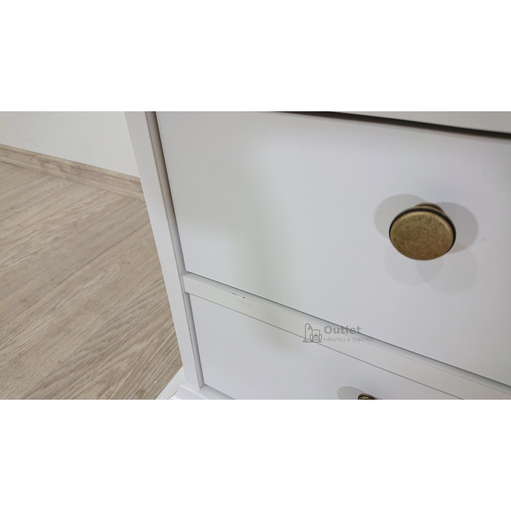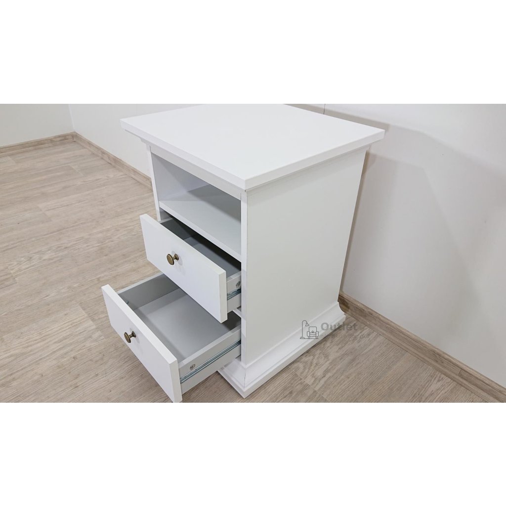Bílý noční stolek s odkládacím prostorem a zásuvkami v elegantním provedení.