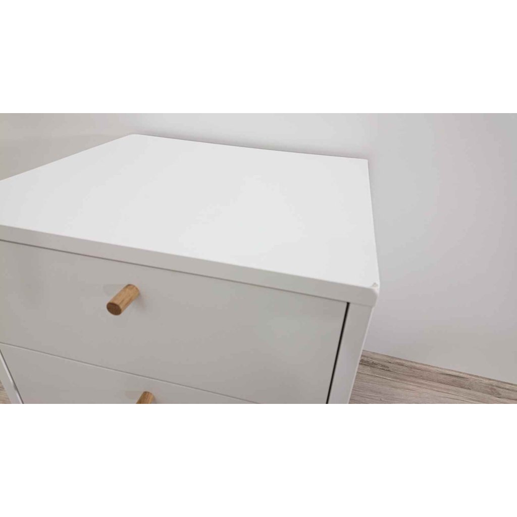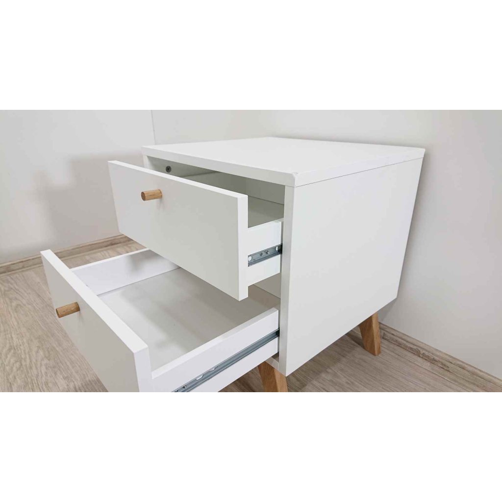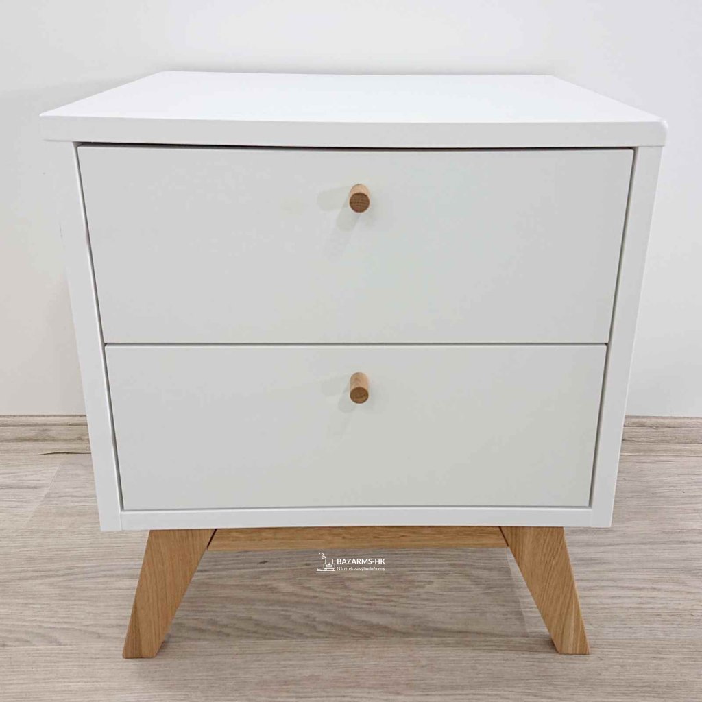 Bílý noční stolek se 2 šuplíčky doplněný o dubové úchytky a nožky ladí se skandi stylem bydlení.