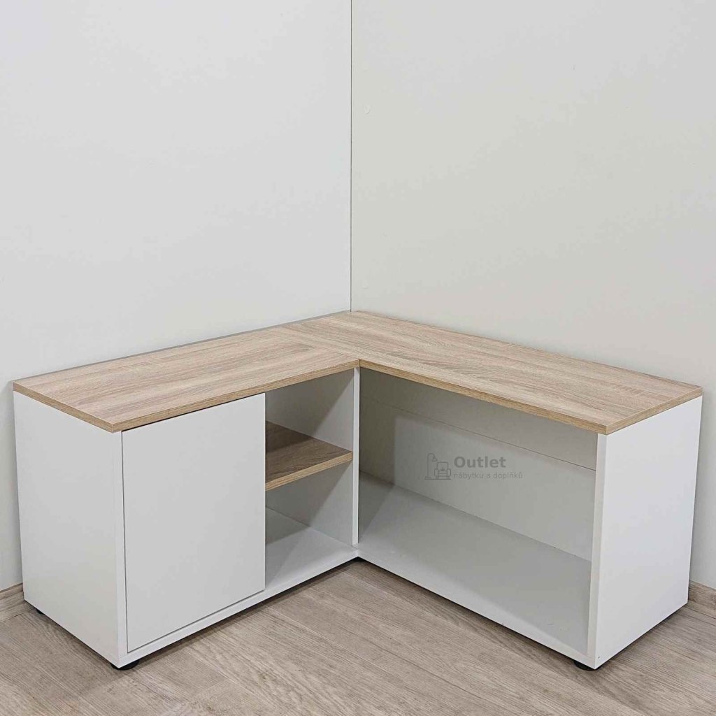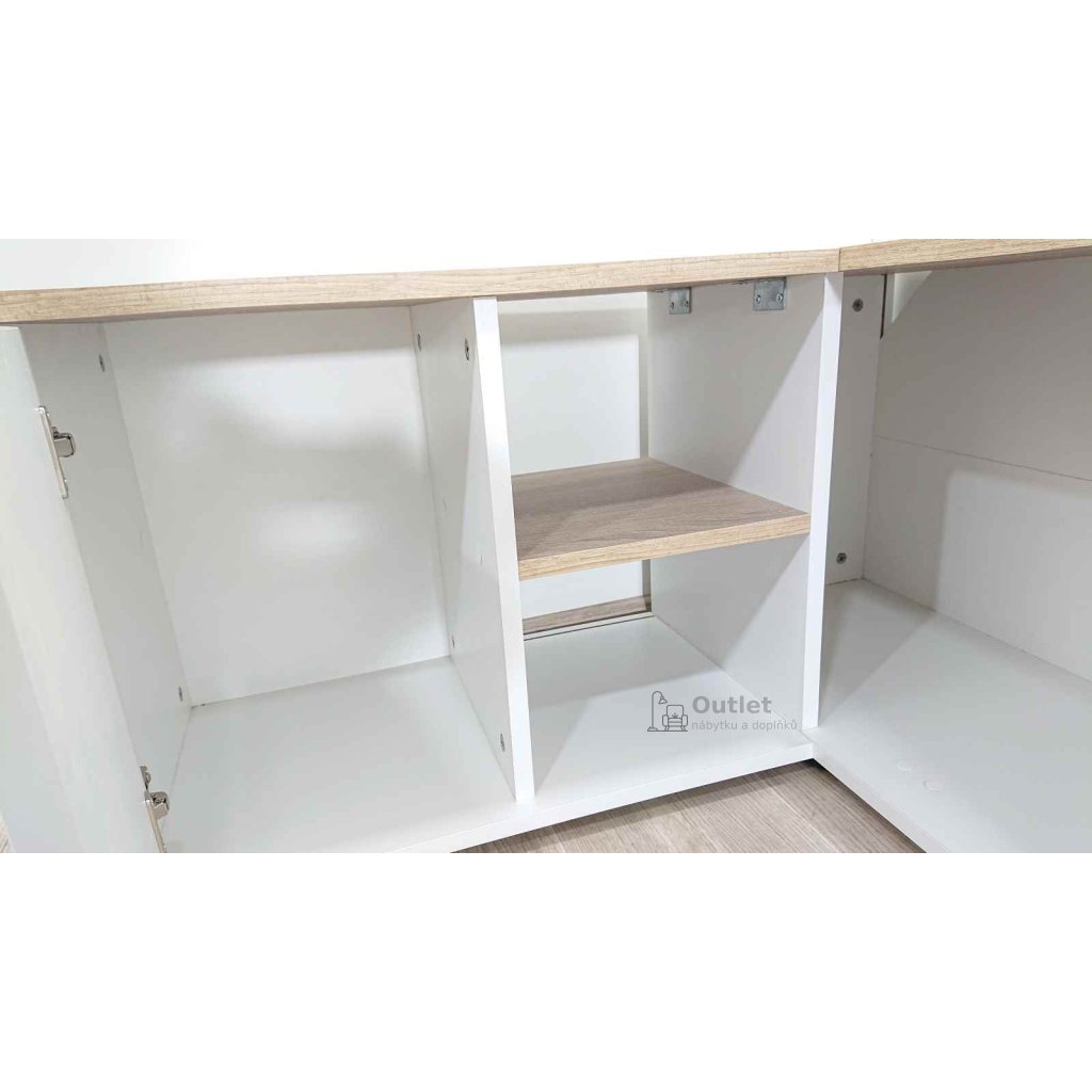 Moderní TV komoda vhodná do rohu místnosti v kombinaci bílé barvy a dekoru dubového dřeva nabízí i úložný prostor. Tento tv stolek se bude líbit příznivcům moderních trendů.