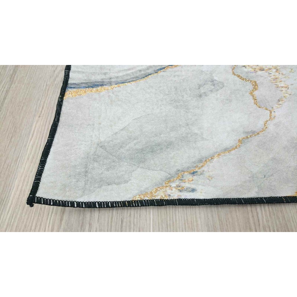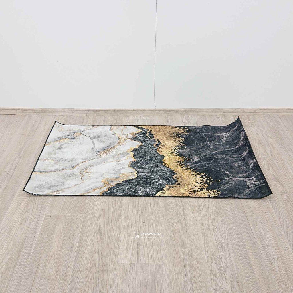 Designový koberec v černo-bílo-zlatém provedení. Ideální pod konferenční stolek do obýváku nebo do ložnice před postel. Velkou výhodou je protiskluzová spodní strana a také pratelnost.