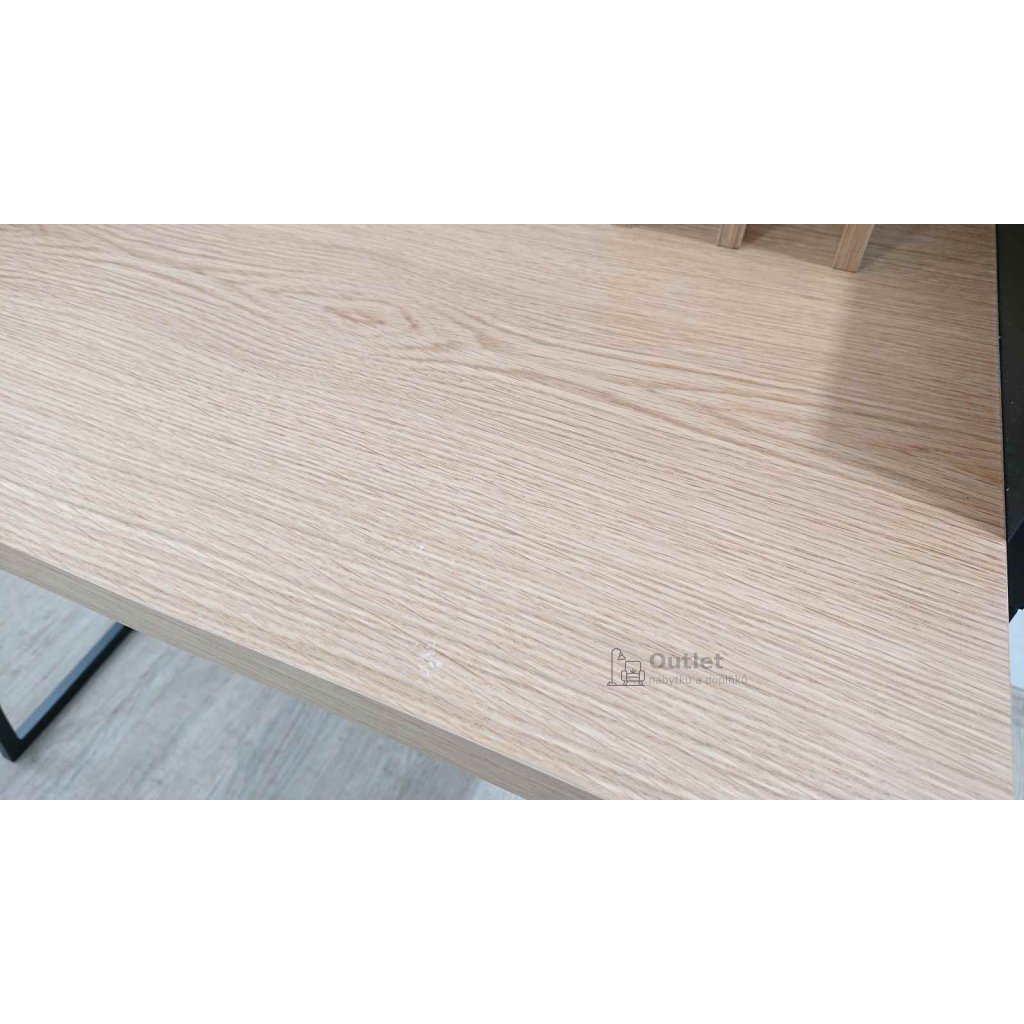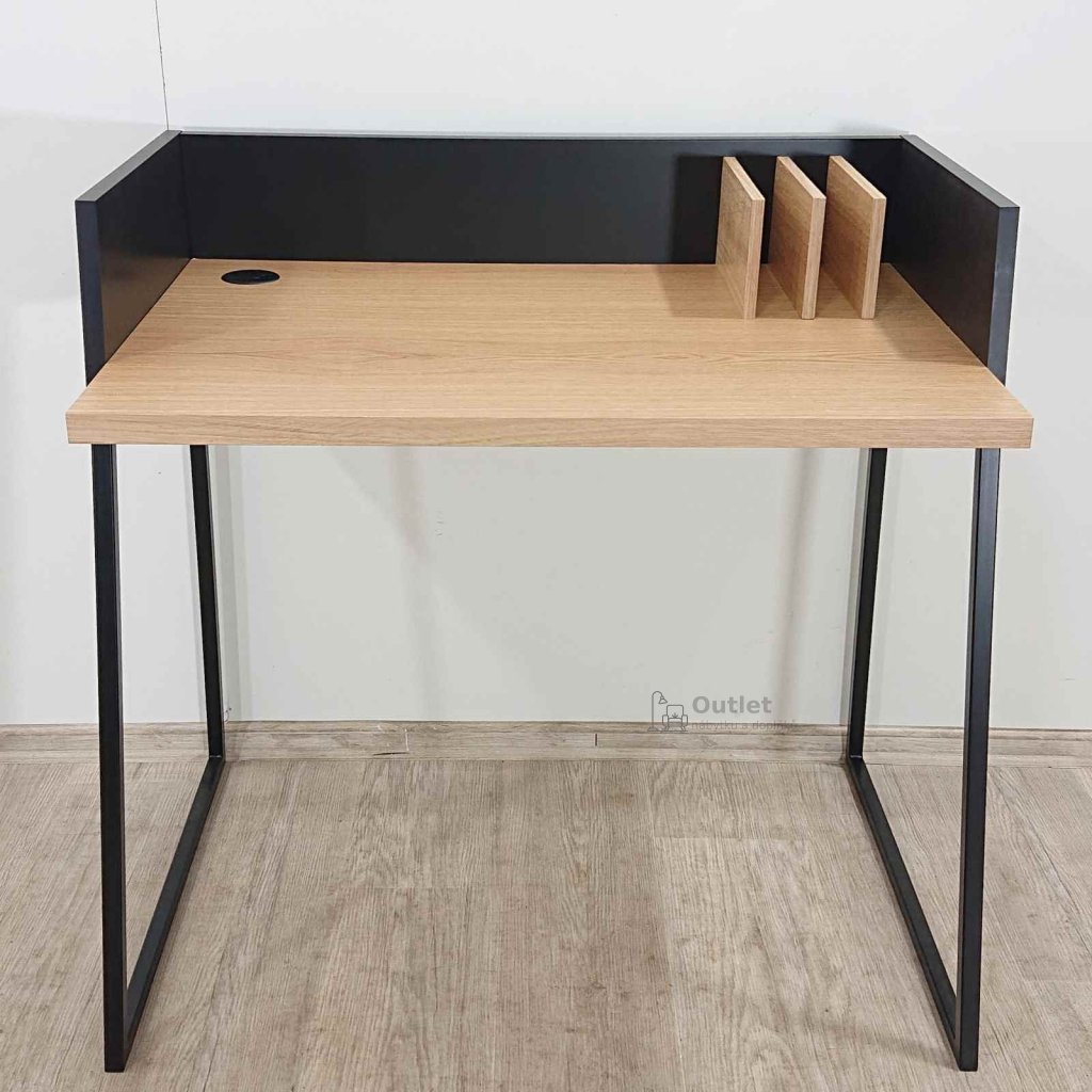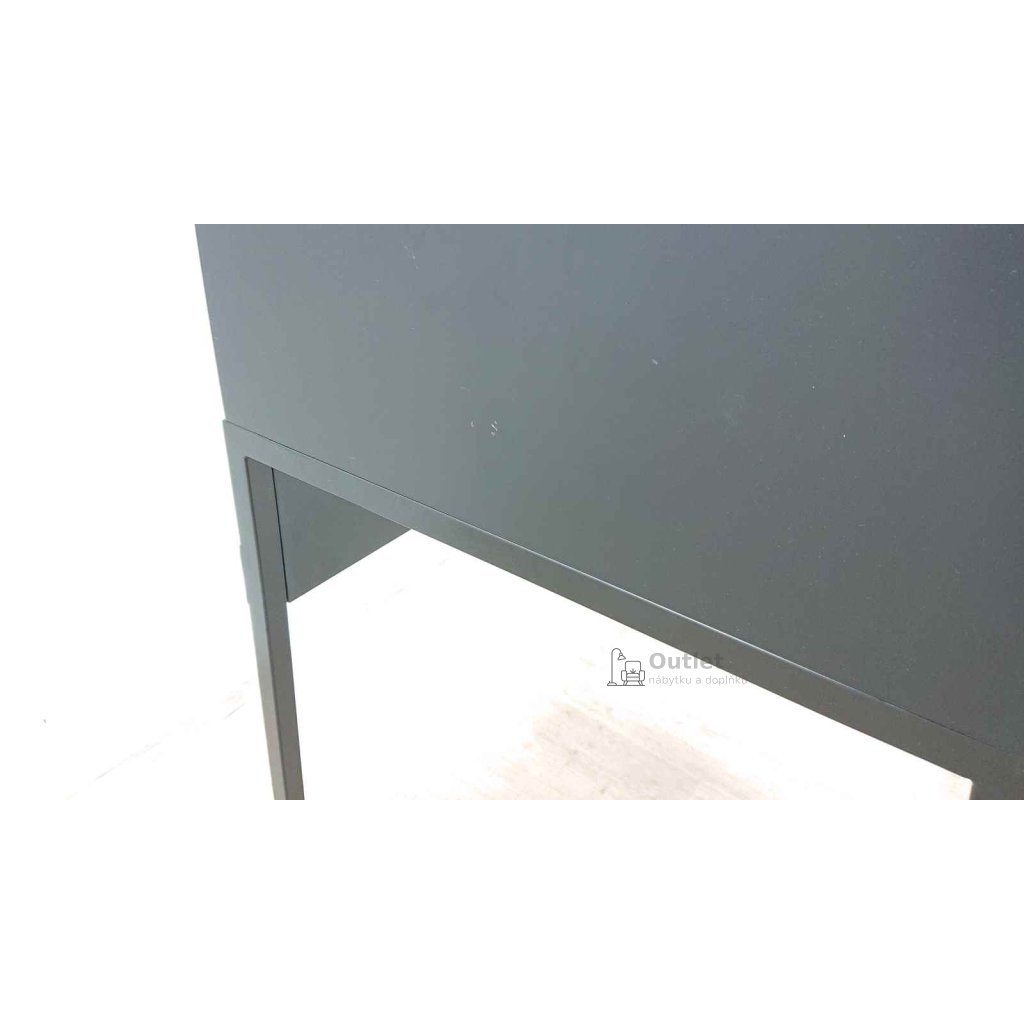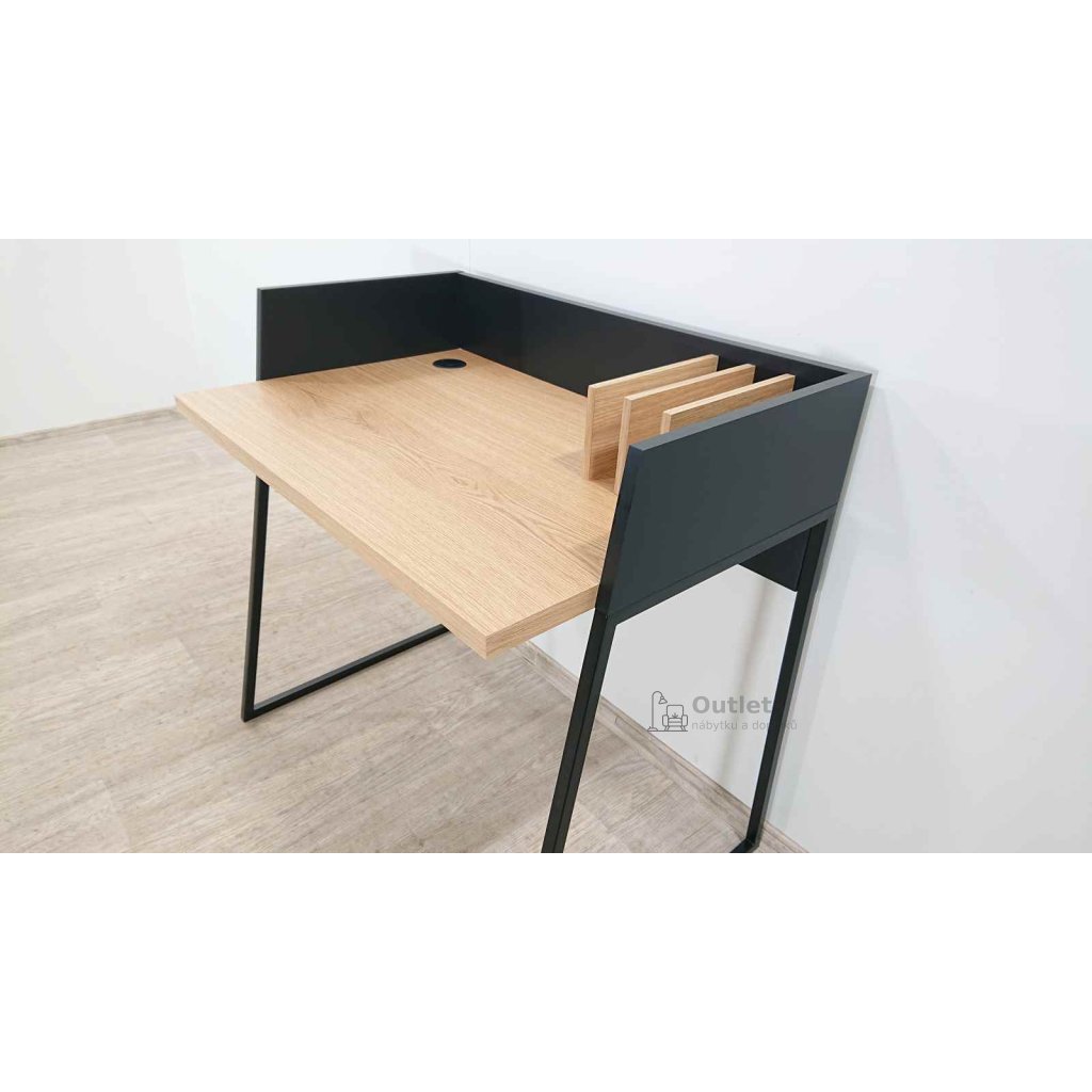 Moderní psací stůl s tenkým kovovým podnoží, díky kterému působí stůl elegantně a vzdušně a zbytečně prostor opticky nezaplňuje. Na desce stolu je průchodka na kabely a také přihrádky, které slouží jako praktické zarážky na knihy a papíry.