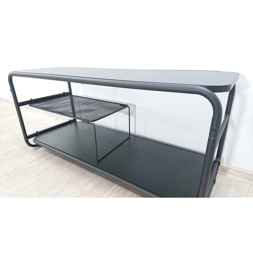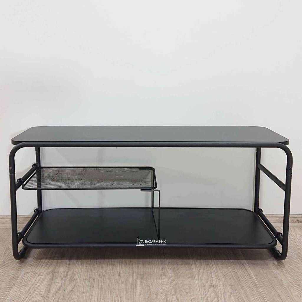 Černá TV komoda s kovovou konstrukcí je ideální do moderních interiérů. Spodní police jsou nasazená na háčcích, menší drátěnou můžete umístit na pravou i levou stranu.