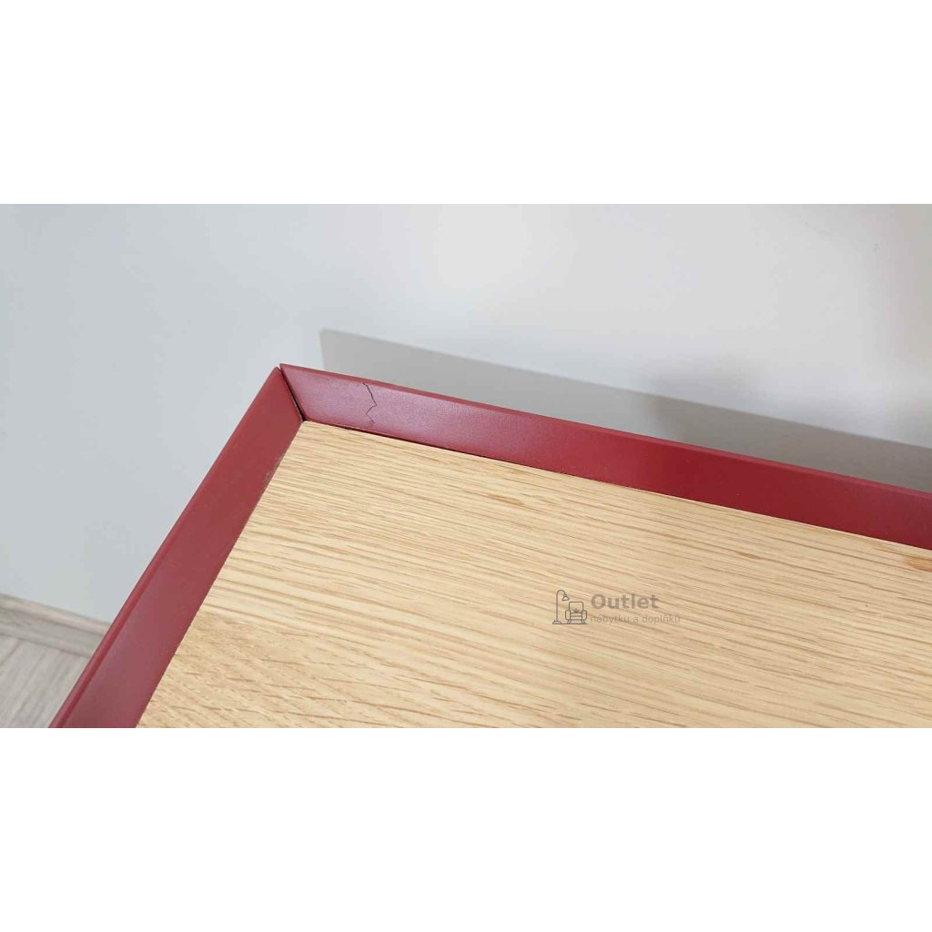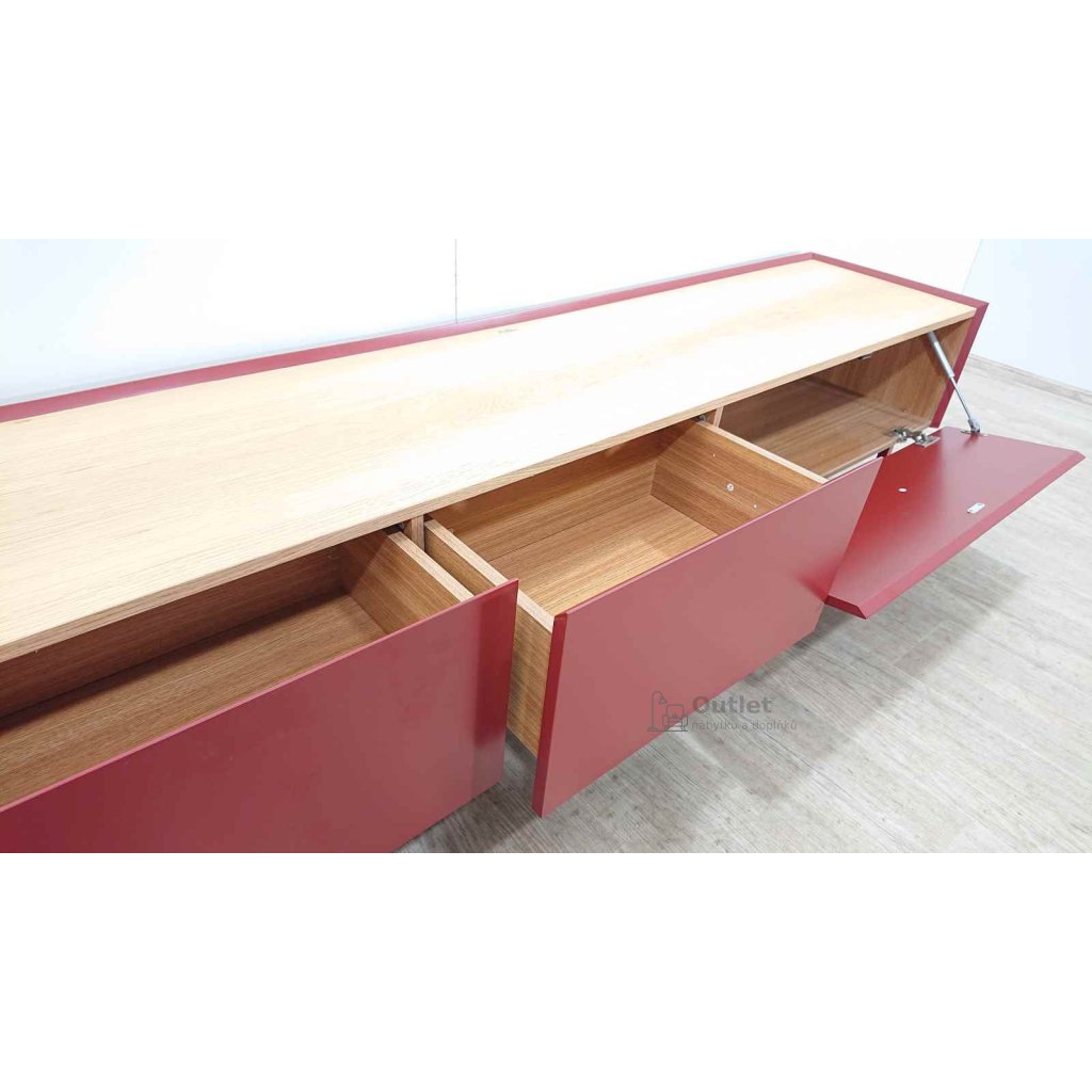 Moderní TV komoda, která kombinuje přírodní strukturu dřeva s tmavě červenou barvou. Tento tv stolek se bude líbit příznivcům moderních trendů. Televizní stolek obsahuje dvě zásuvky a úložný prostor za výklopnými dvířky. Šuplíky i dvířka mají tlumené dovírání.