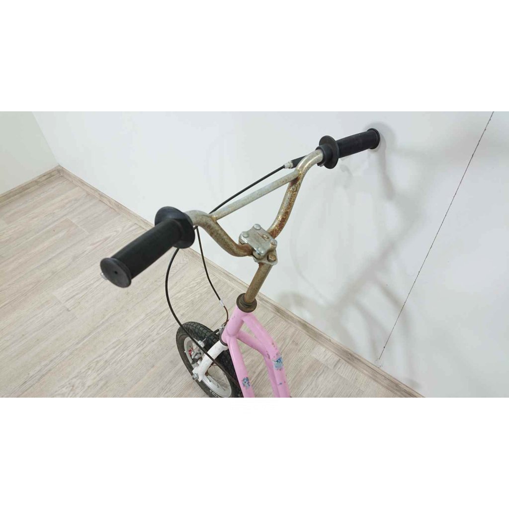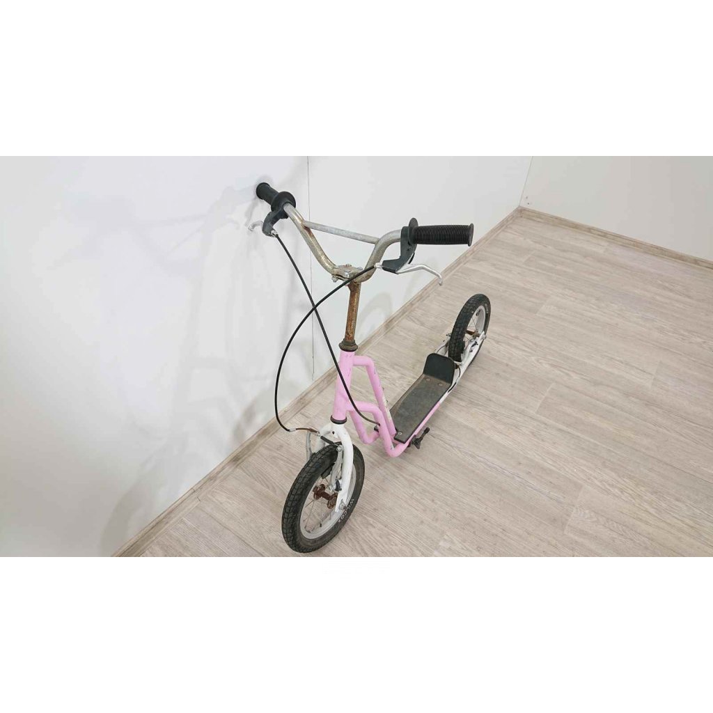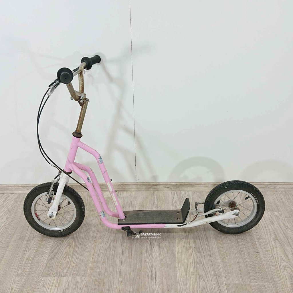 Růžová koloběžka s nafukovacími koly, se dvěma brzdami a stojánkem. Vhodné pro výšku postavy od cca 100 cm do cca 145 cm (věk zhruba 6-10 let).