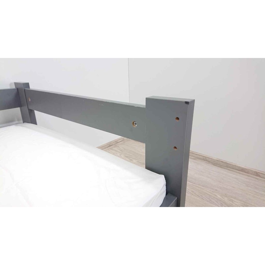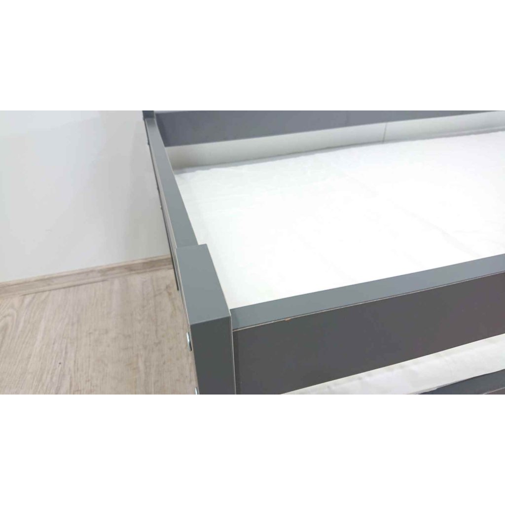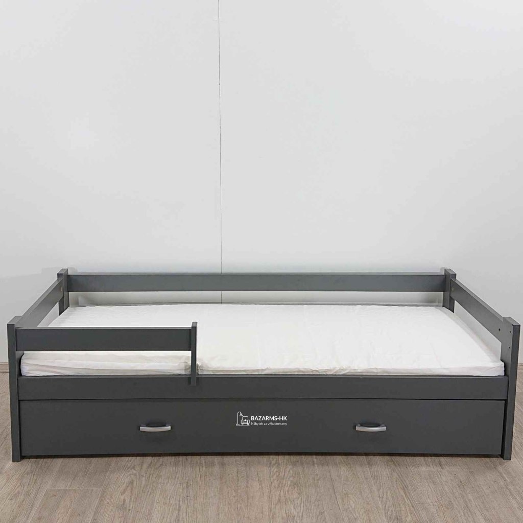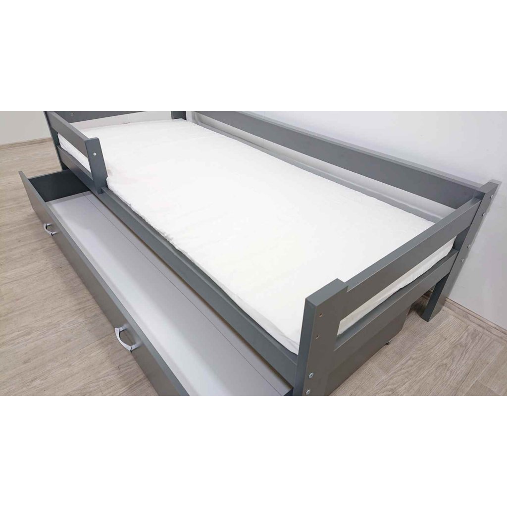 Šedá postel pro děti, ve které se jim bude krásně usínat. Na jedné straně je bočnice a na druhé zábrana, takže postýlka dětem dodává pocit bezpečí. Výhodou je praktický úložný šuplík na kolečkách, který se bude dětem dobře ovládat. Součástí je i molitanová matrace.