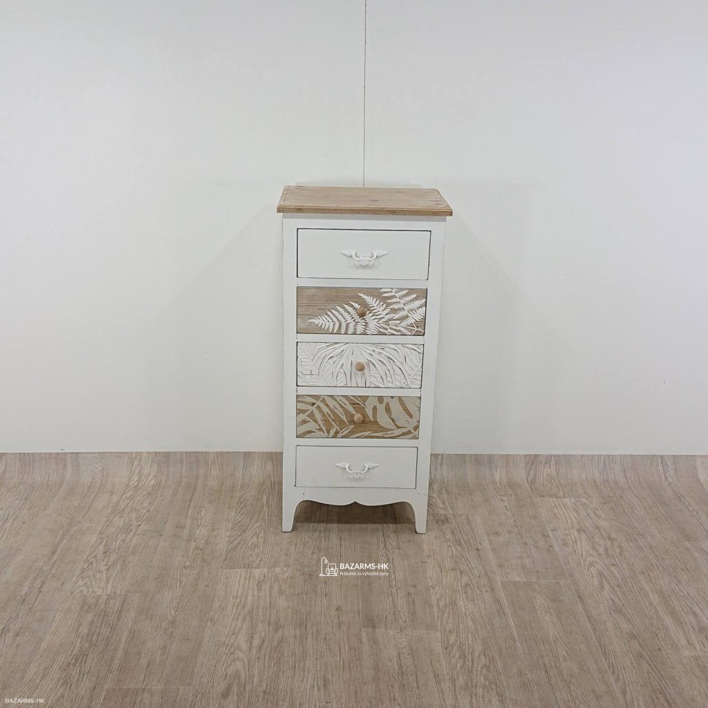 Romantická komoda s jemnou patinou lze využít v obávacím pokoji, v ložnici i předsíni. 48 x 35 x 102 cm (šířka x hloubka x výška).