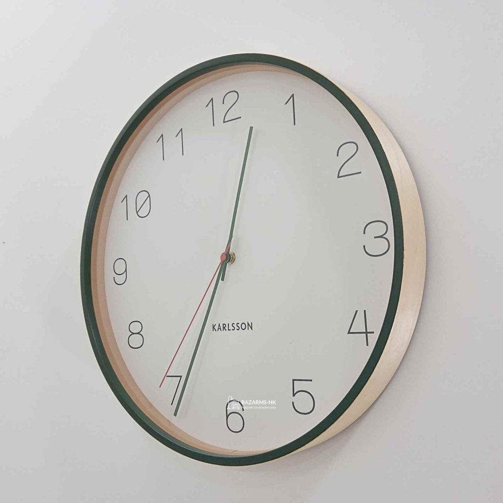 krásné hodiny, které potěší příznivce přírodního materiálu. Jsou dřevěné a lemuje je zelený okraj.
