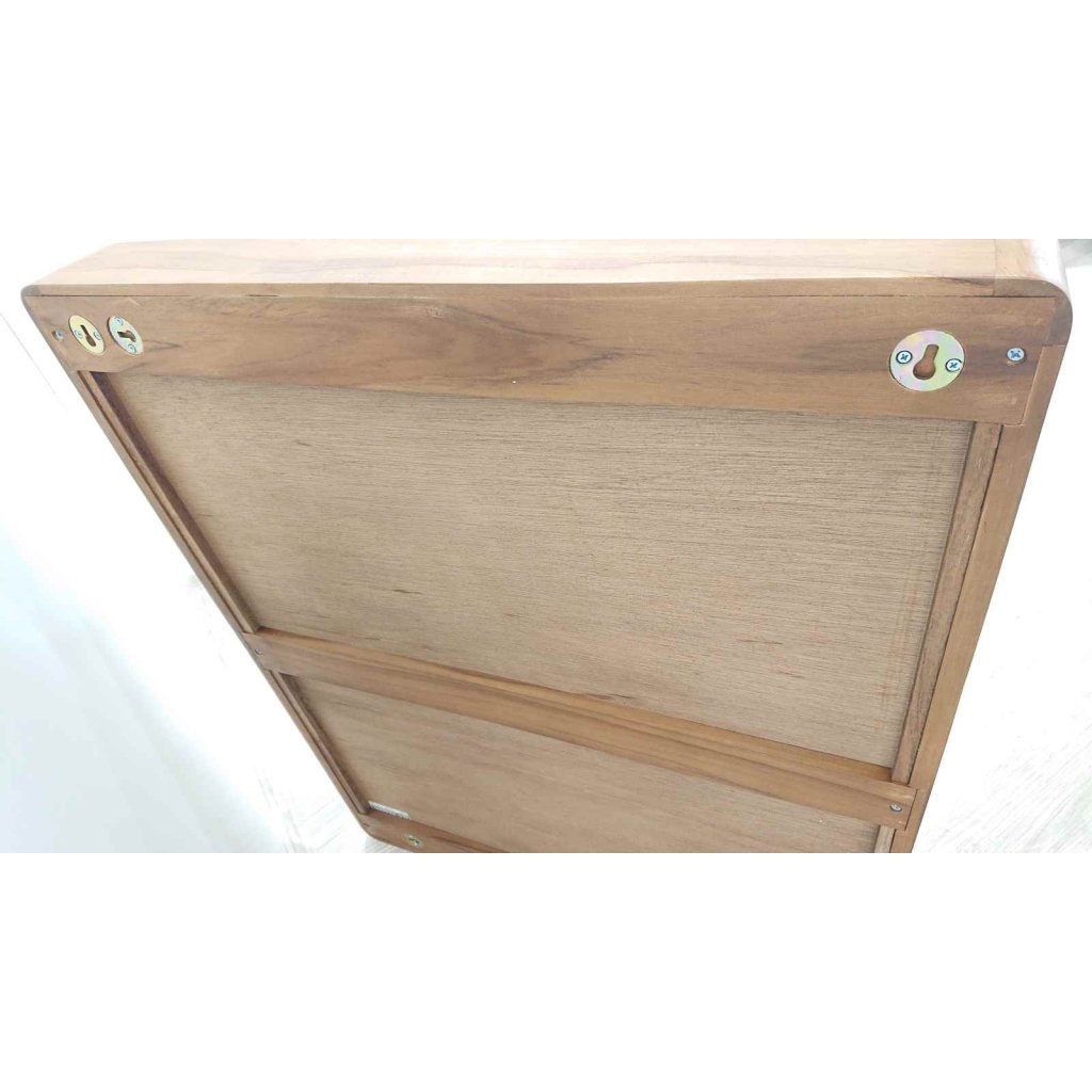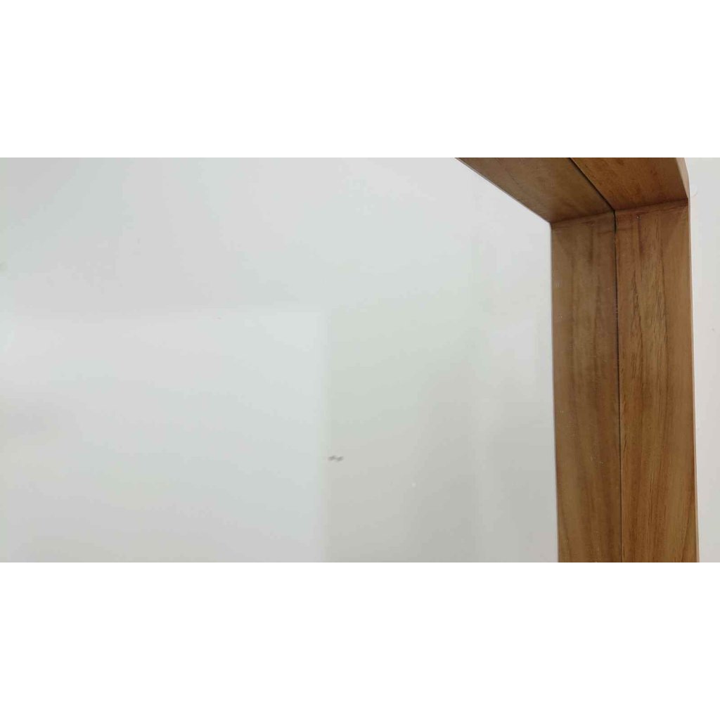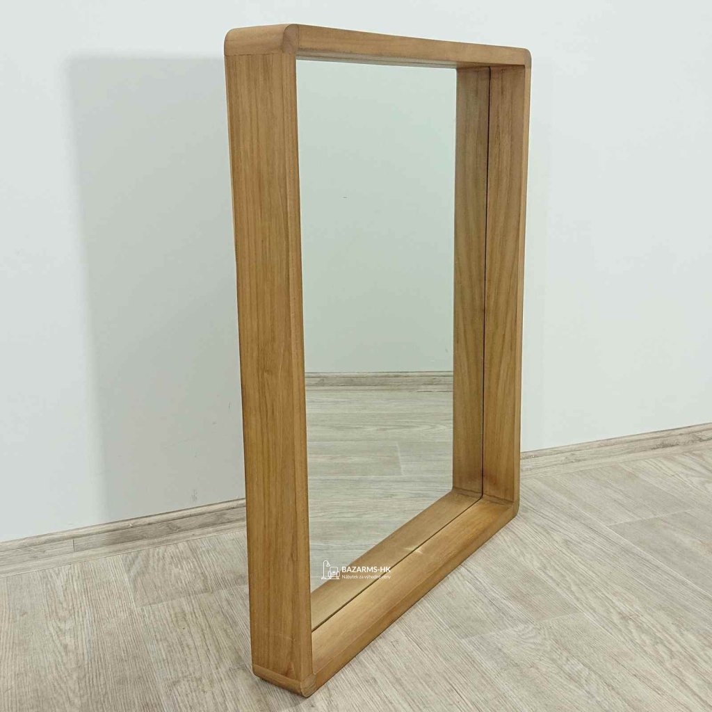 Krásné zrcadlo s teakovým rámem, které můžete zavěsit na výšku i na šířku.