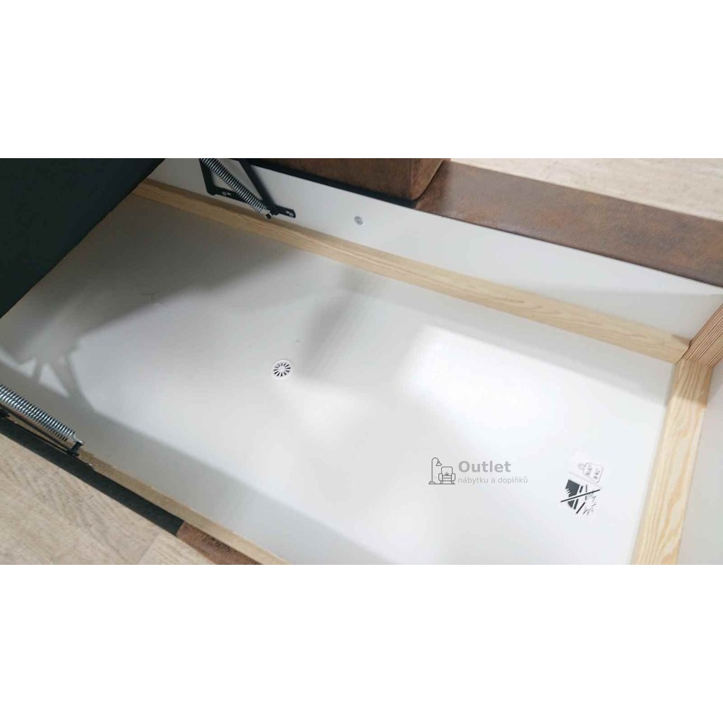 Výstavní kus, původně součást větší sedačky, poškozené dno úložného prostoru.
