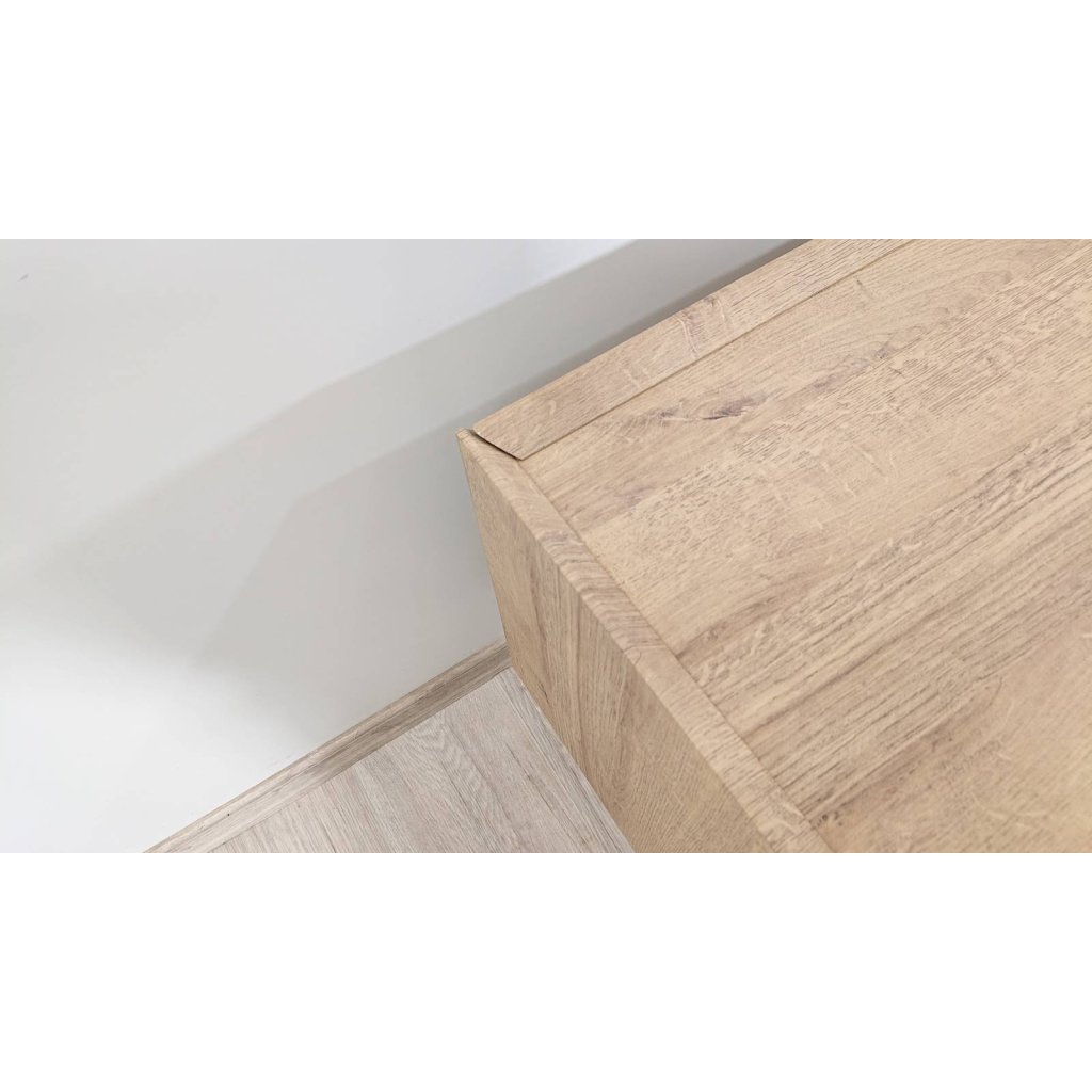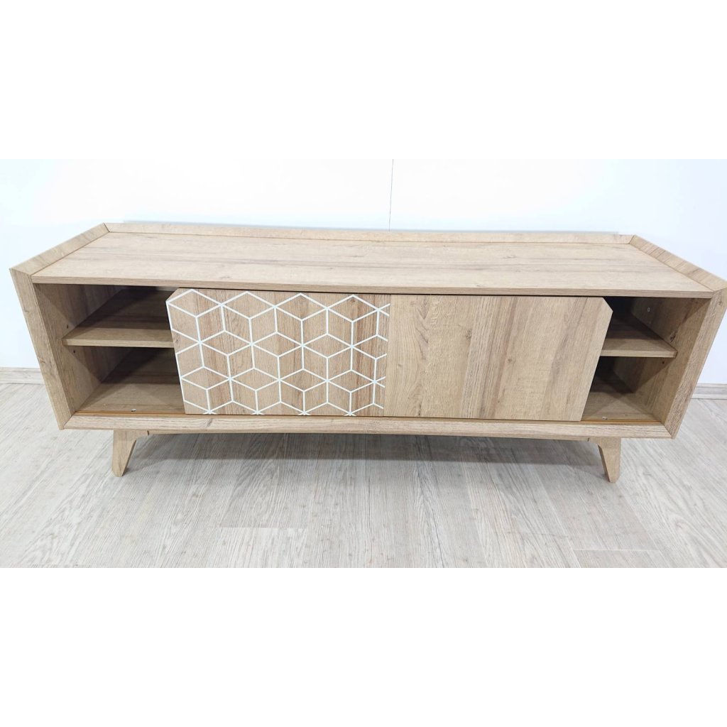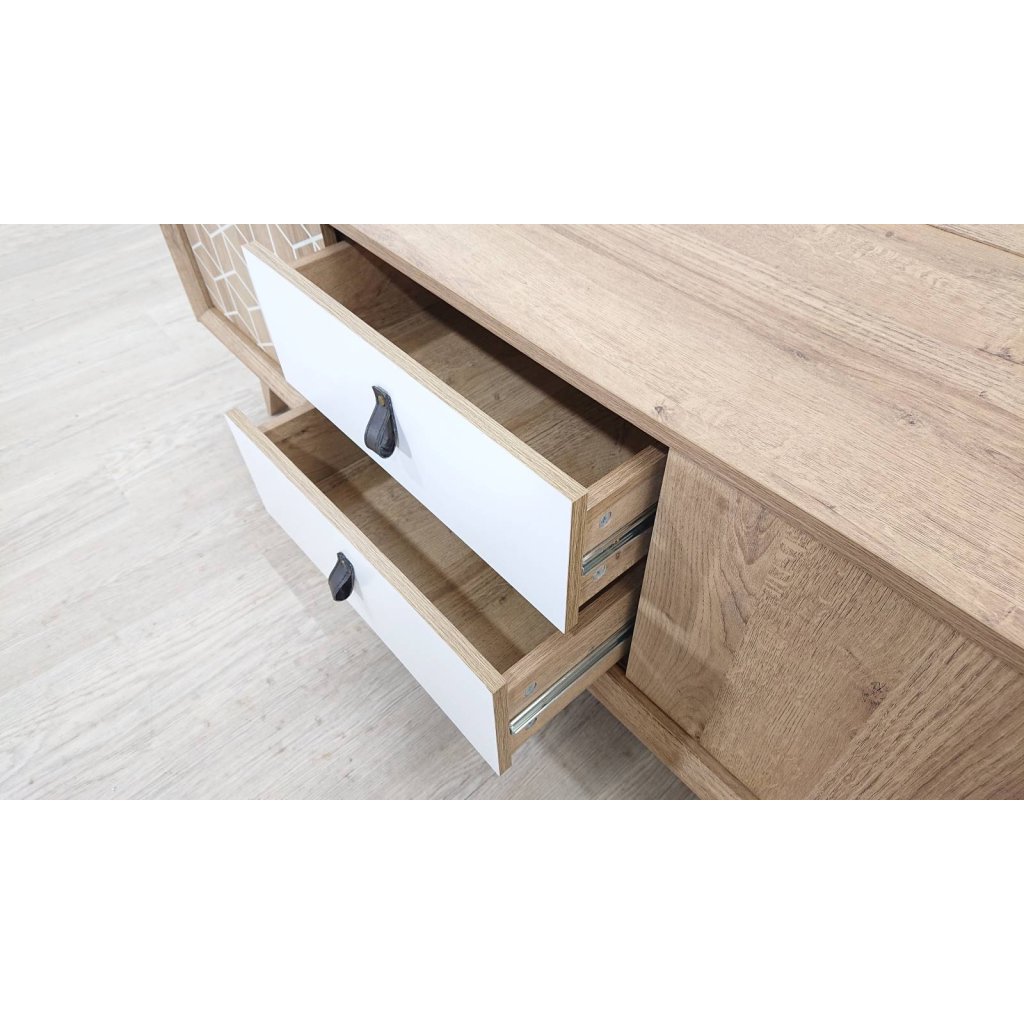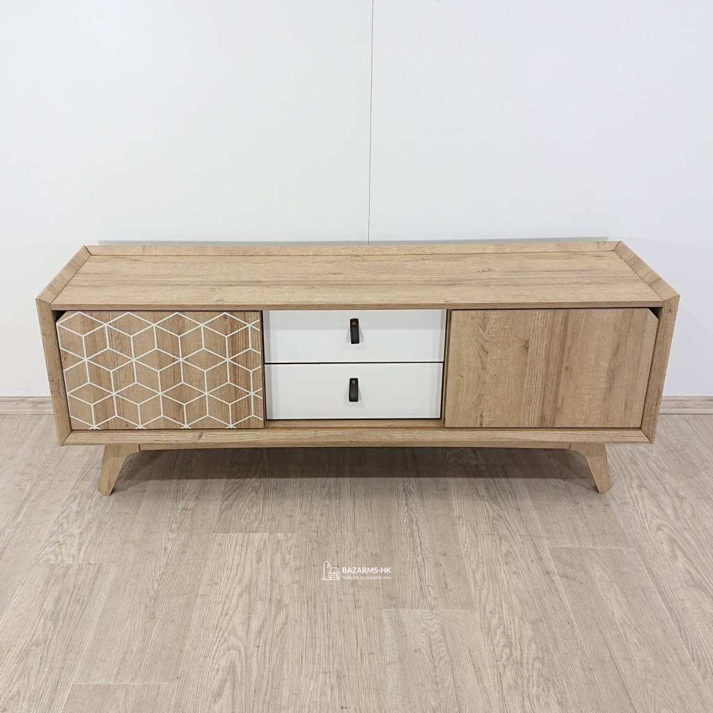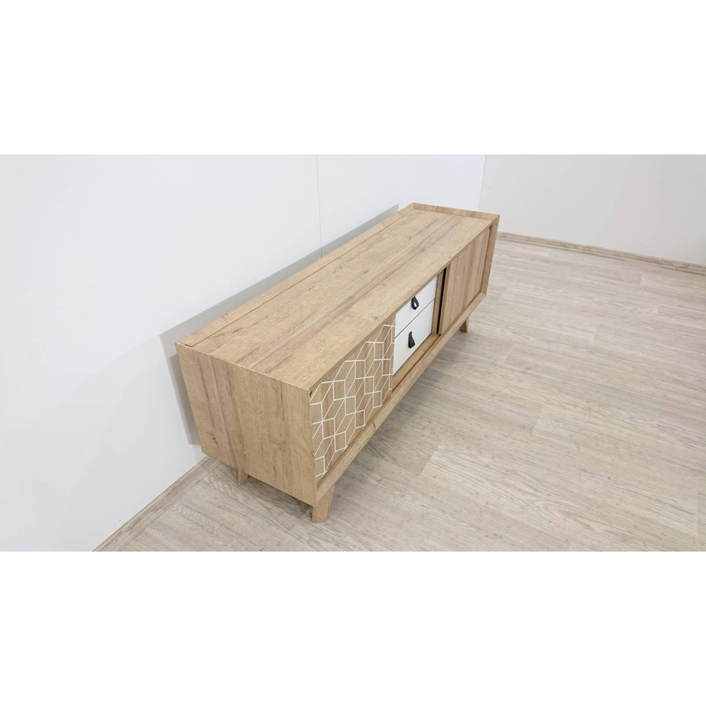 Designový televizní stolek s bílými detaily. Po stranách jsou posuvná dvířka, za kterými jsou police, kam můžete uložit dokumenty ale i elektroniku. Police jsou výškově stavitelné a lze je i vyndat, takže si můžete členění přizpůsobit svým potřebám. Navíc záda jsou v těchto místech opatřena otvory pro kabely. V prostřední části jsou dvě zásuvky doplněné o kožené úchytky. Bílý dekor na dvířkách působí jemným dojmem.