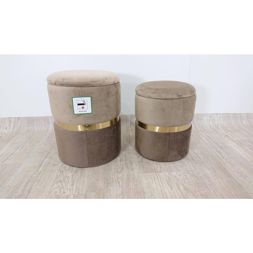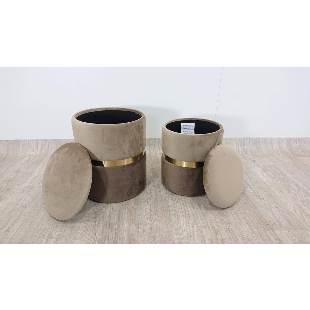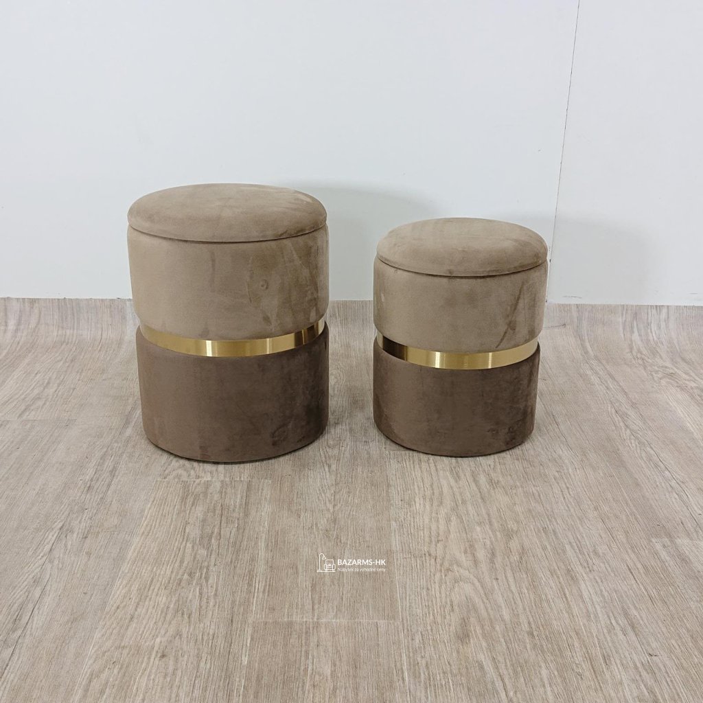 Sada 2 stoliček v příjmných hnědých tónech doplněné o zlatý proužek. Poslouží jako podnožky u křesla nebo pohovky, jako stolička na sezení i jako taburetka na odložení věcí. v neposlední řadě to bude krásná dekorace vašeho interiéru.