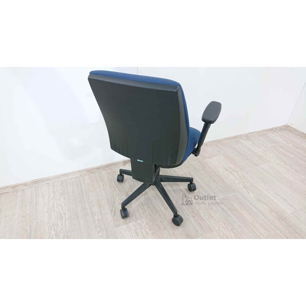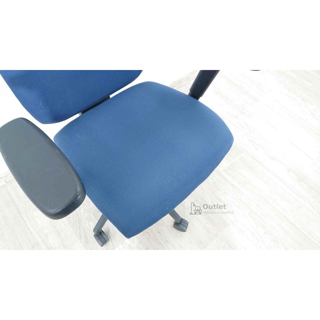 Otočná kancelářská židle v modré barvě. Otočné kancelářské křeslo s područkami je výškově stavitelné. Dále je možné nastavit výšku područek i jejich vzdálenost od židle a také výšku zádové opěrky.
