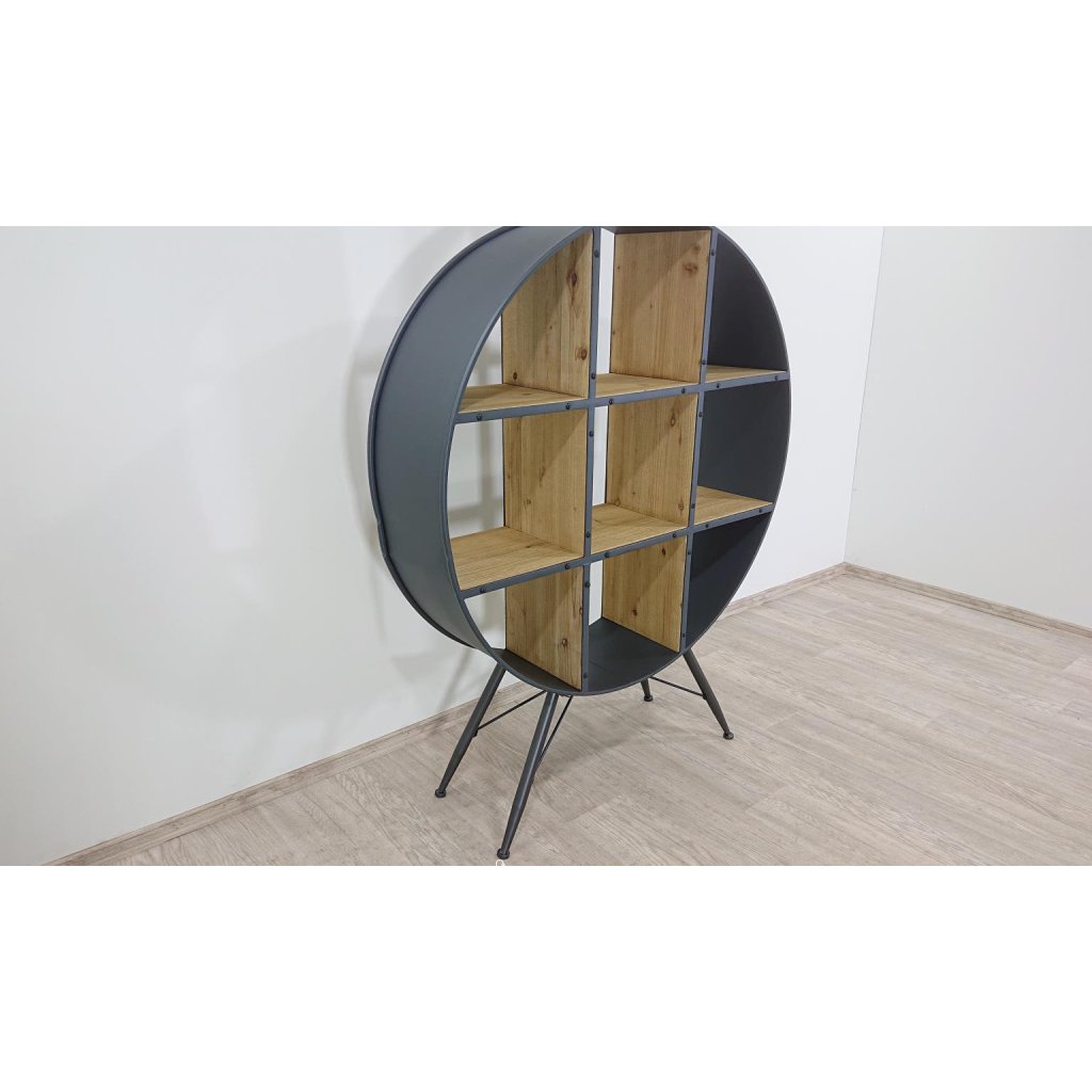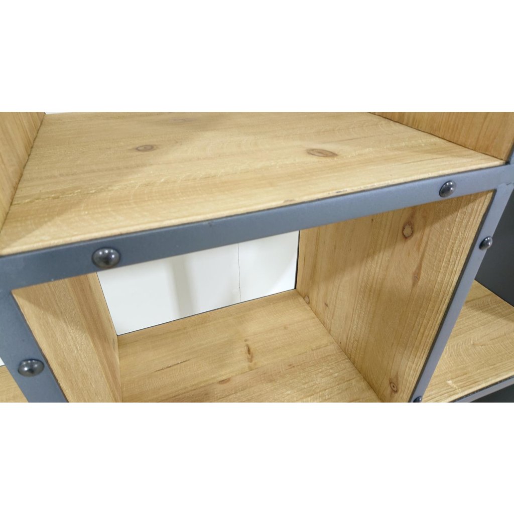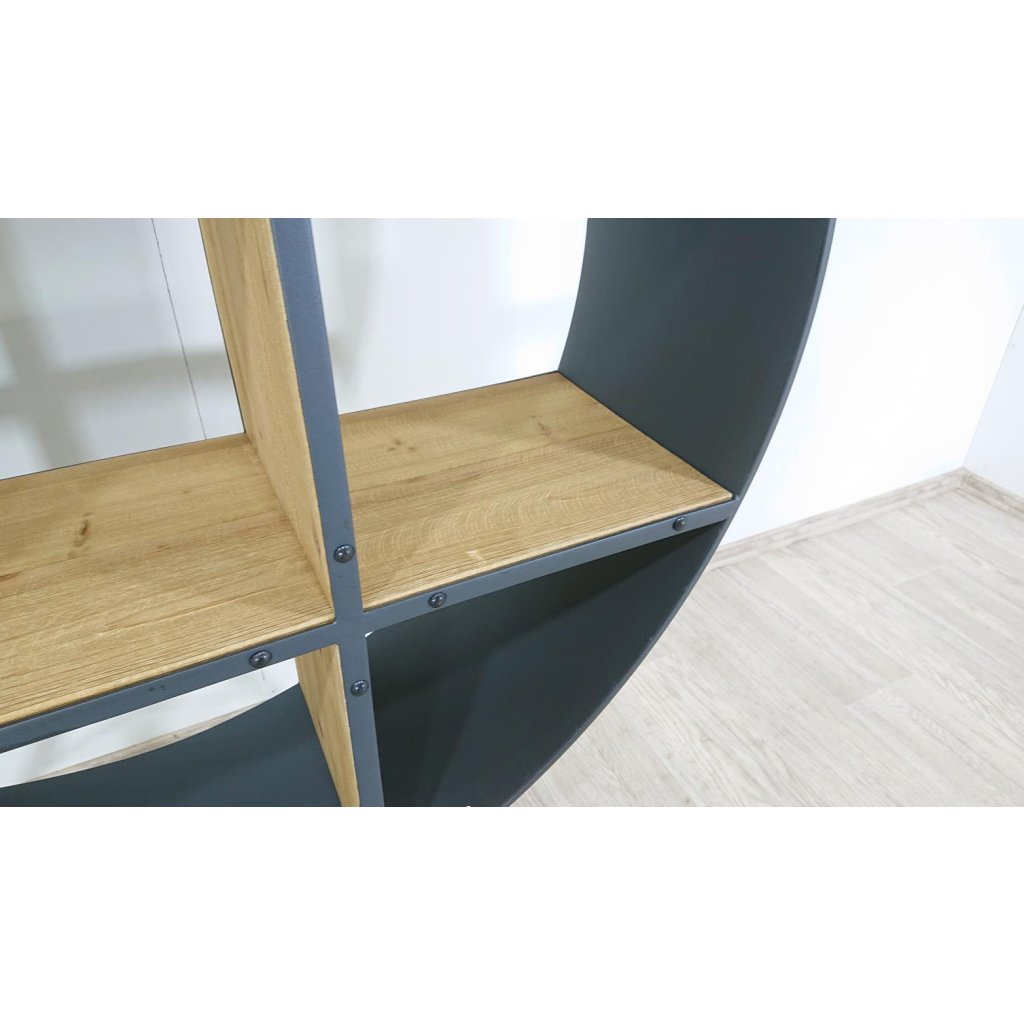 Designová knihovna laděná do industriálního stylu s kovovou konstrukcí a dřevěnými poličkami.