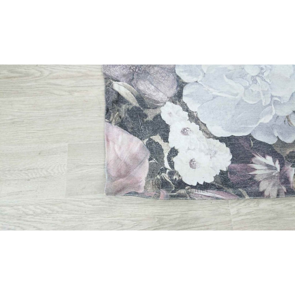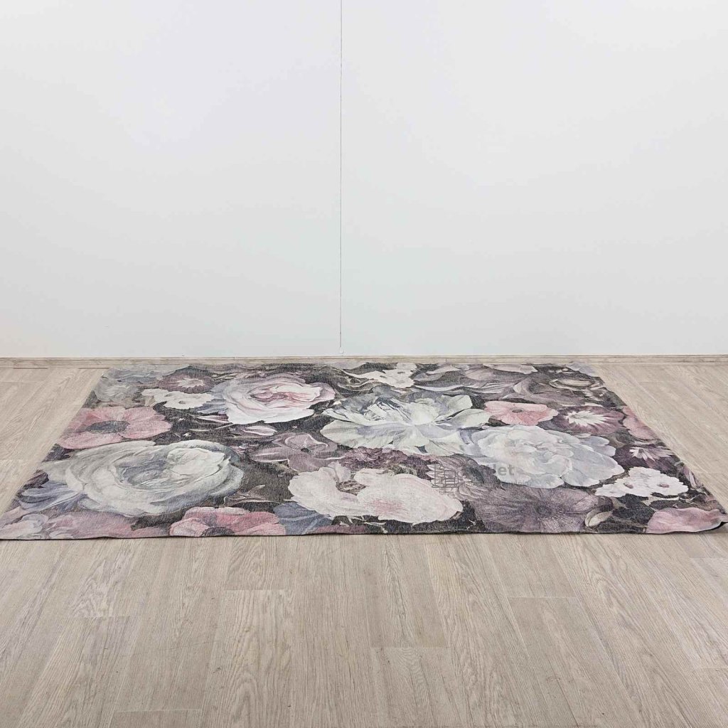 Koberec s motivem květin v decentních barvách, základ koberce je šedý a je doplněn o květy v jemných bílo-růžových tónech.