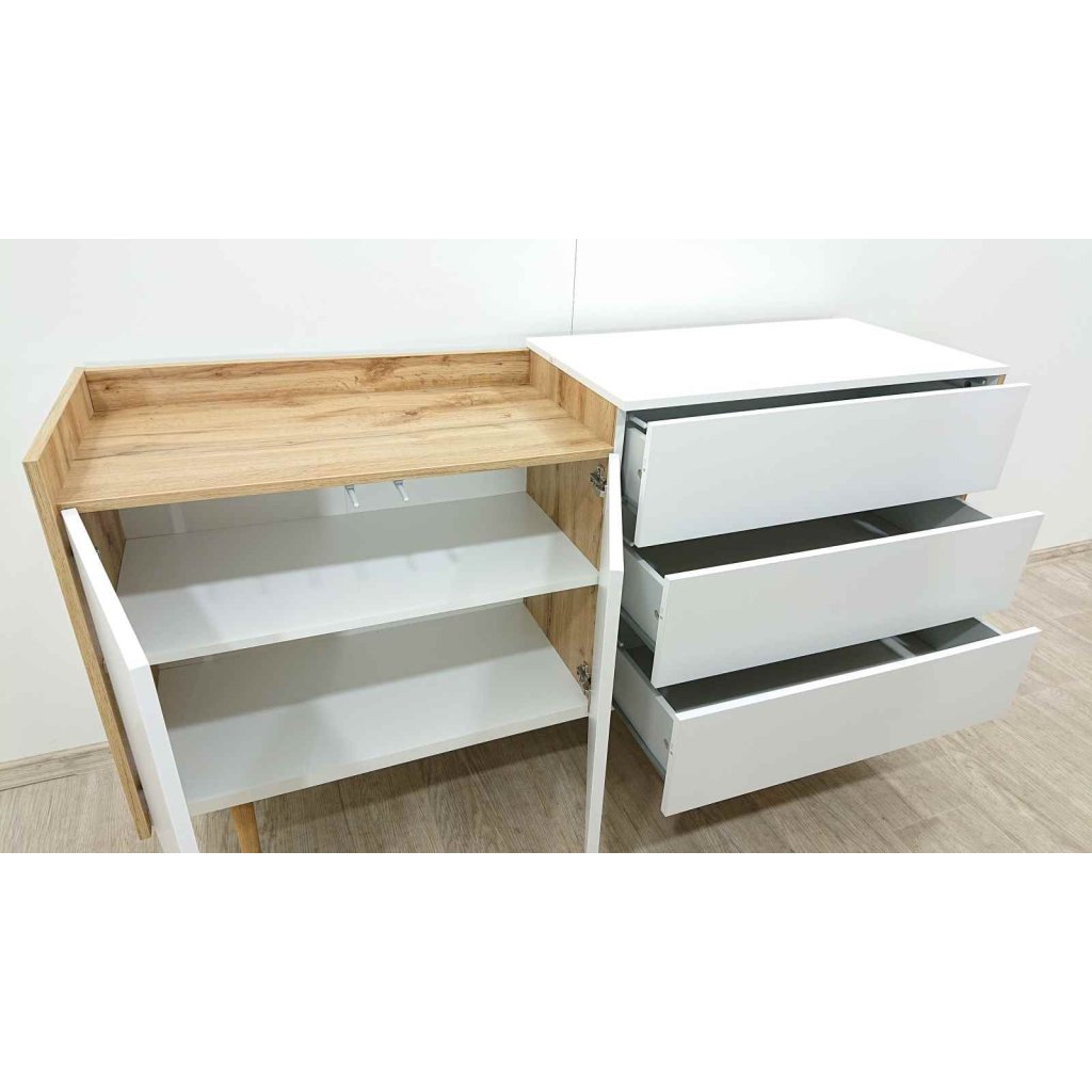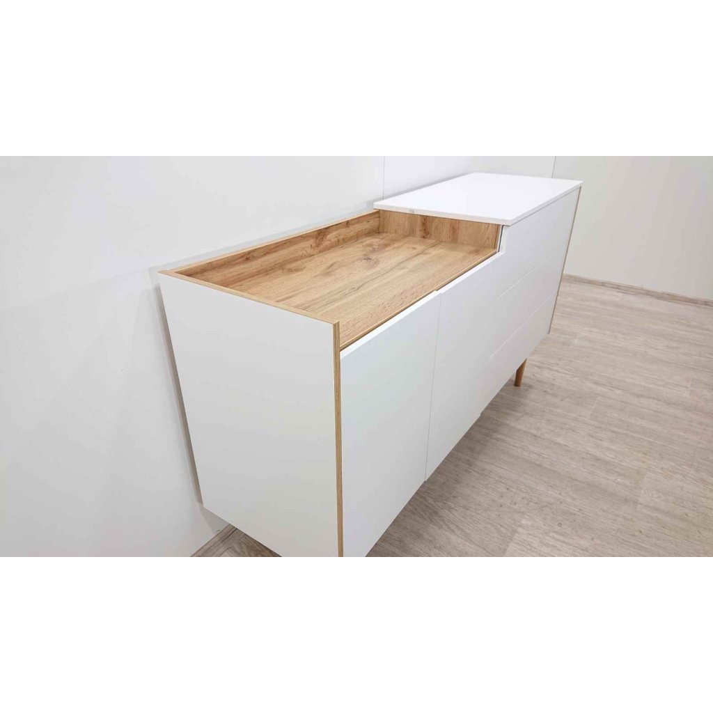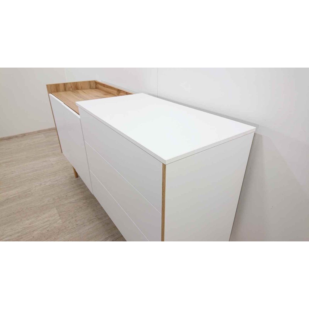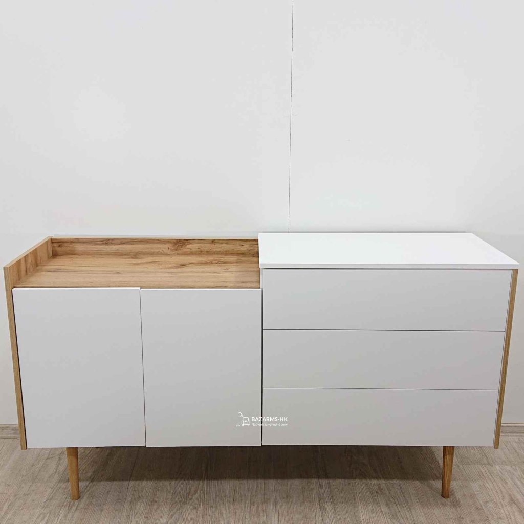 Designová komoda na nožičkách se šuplíky a policemi. Zásuvky i dvířka mají dotykové tip-on otevírání.