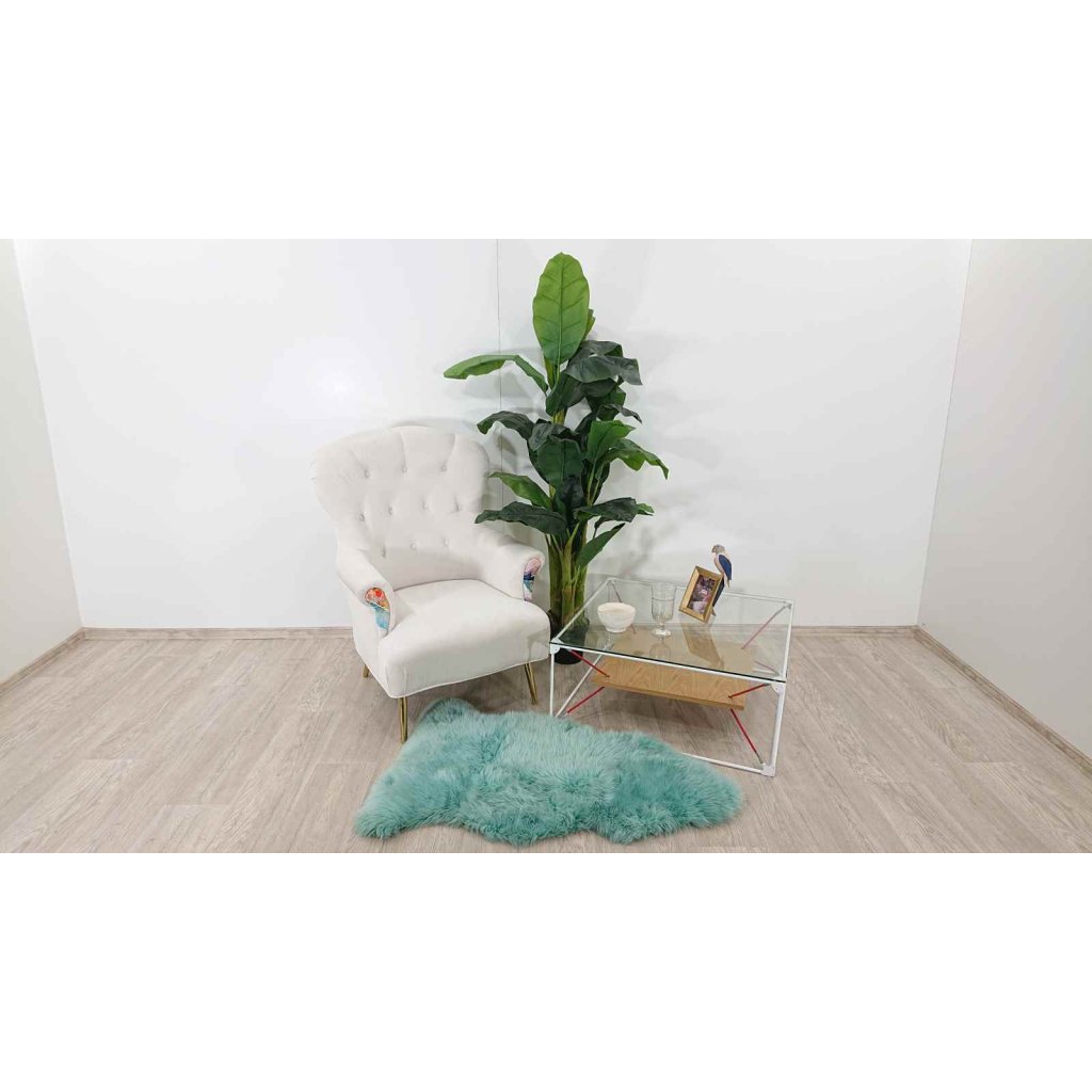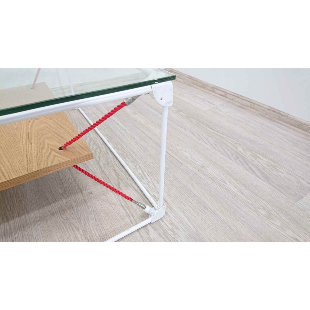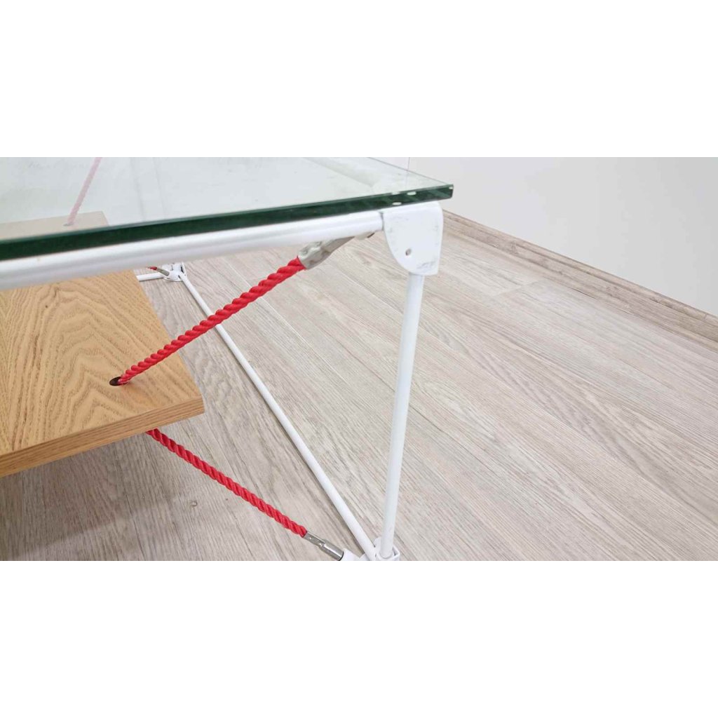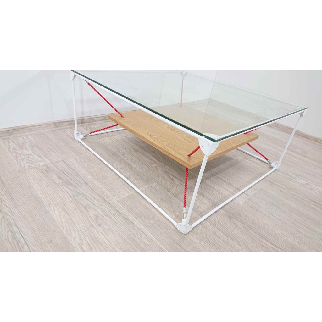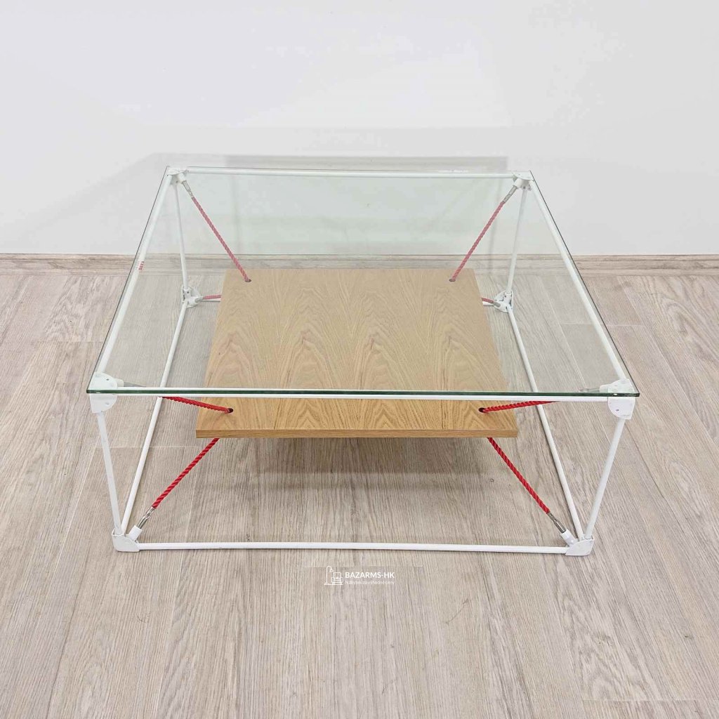 Originálně řešený stolek značky Kare Design se skleněnou vrchní deskou, uprostřed deska zavěšená na lanech, kam si odložíte noviny či ovladače.