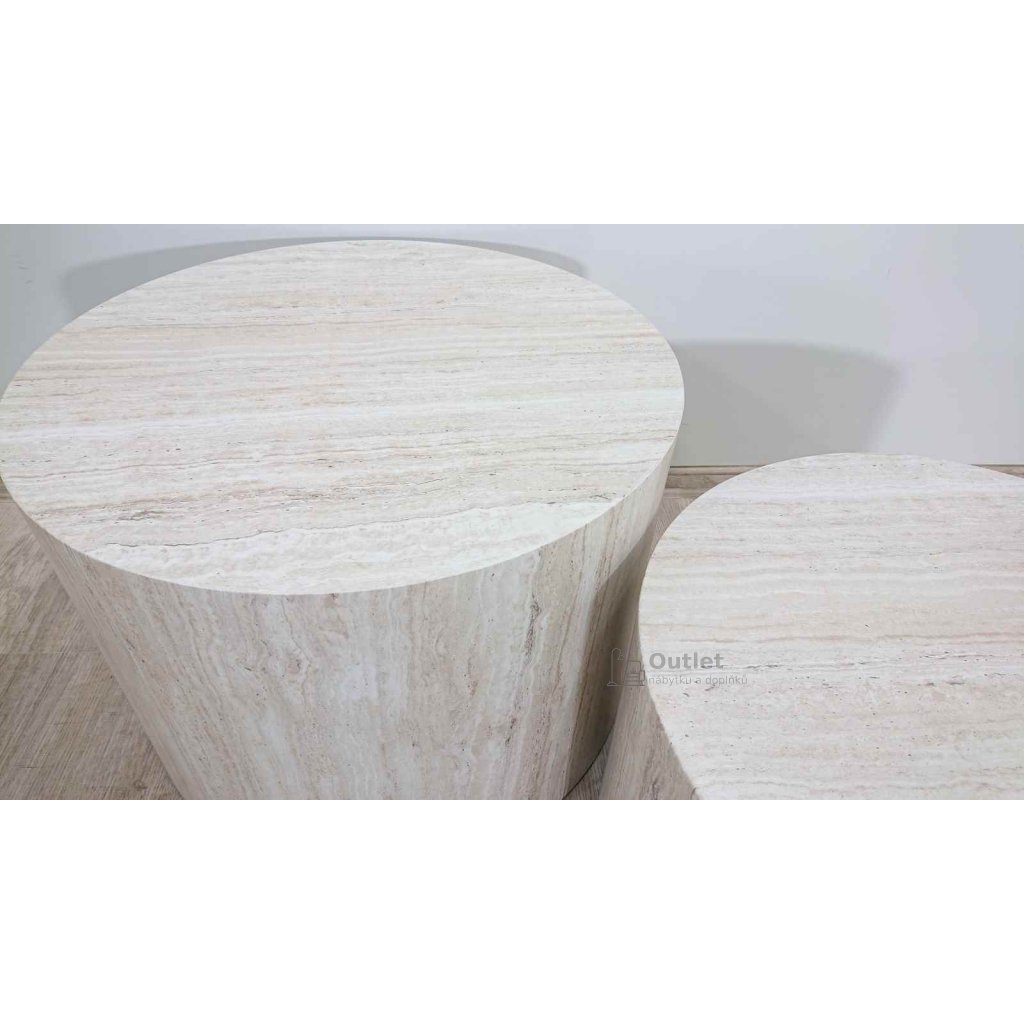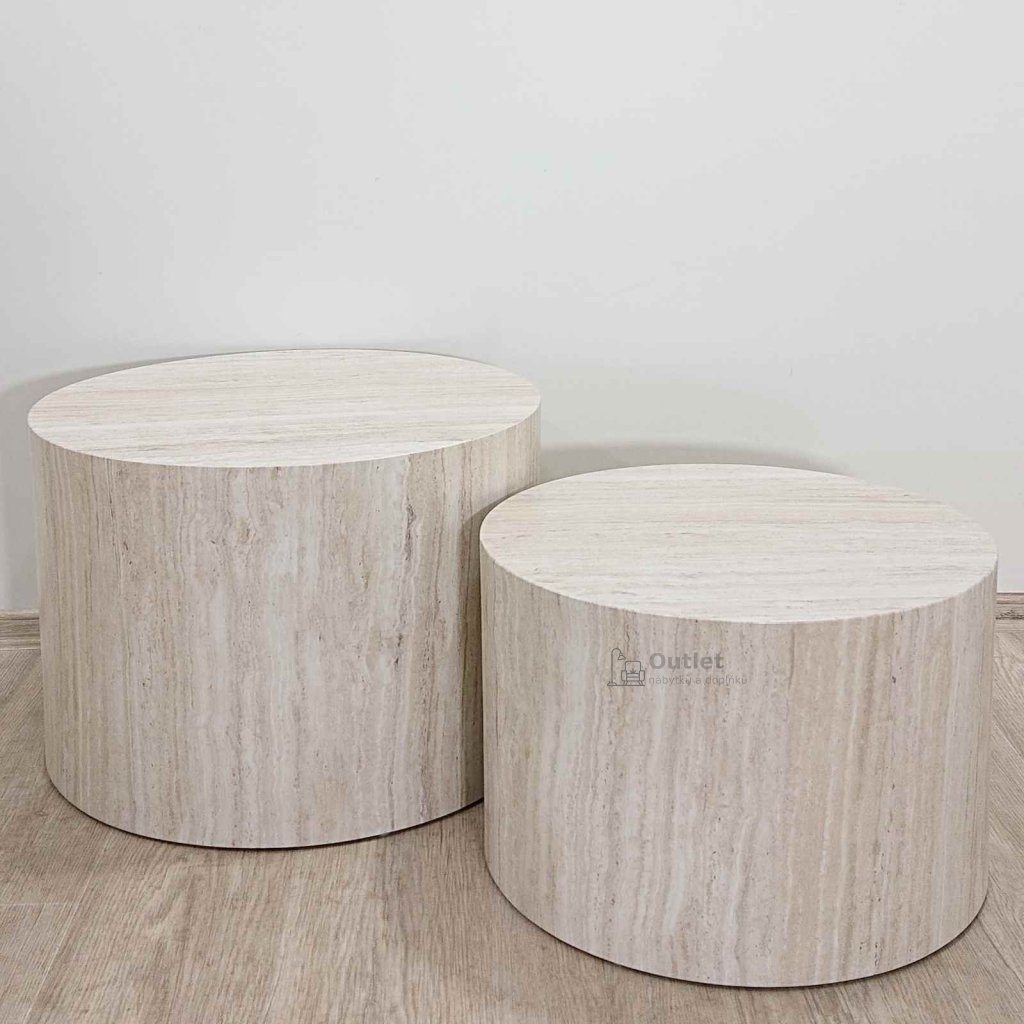 Kulaté stolky v dekoru kamene se hodí k pohovce do moderních obýváků. Stolky jsou dostatečně velké, takže se na ně vejde pohoštění.