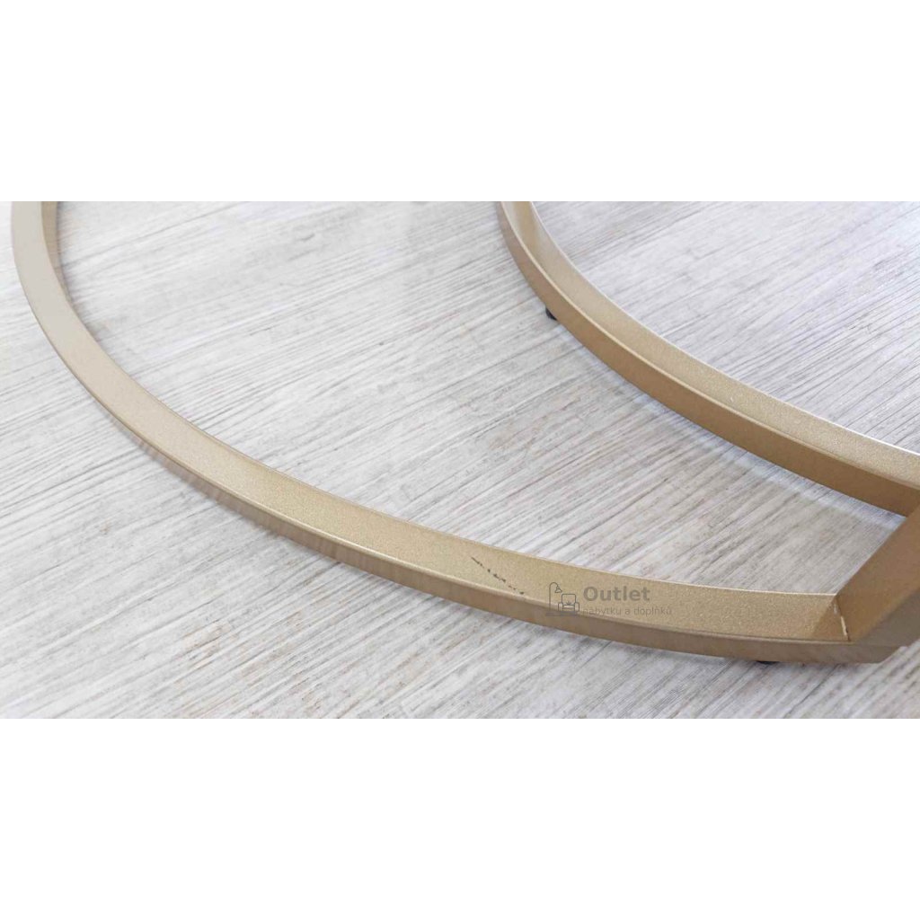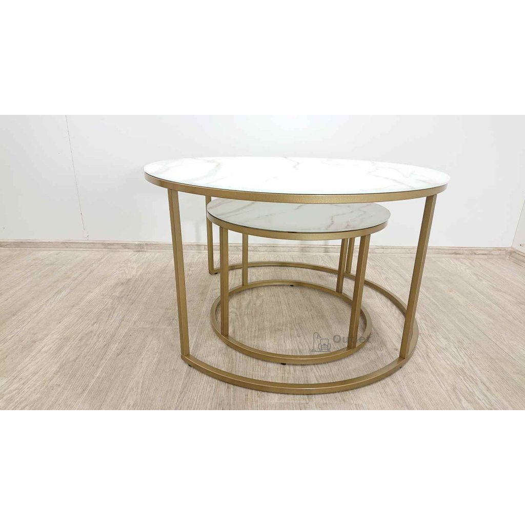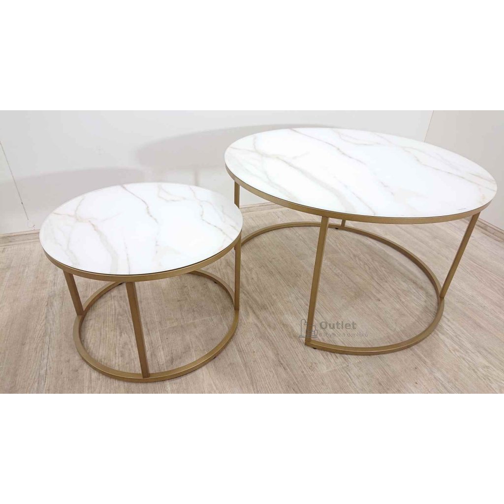 Zlaté kulaté stolky se skleněnými deskami v dekoru mramoru a zlatými konstrukcemi. Hodí se k pohovce do moderních obýváků. Stolky jsou dostatečně velké, takže se na ně vejde pohoštění.