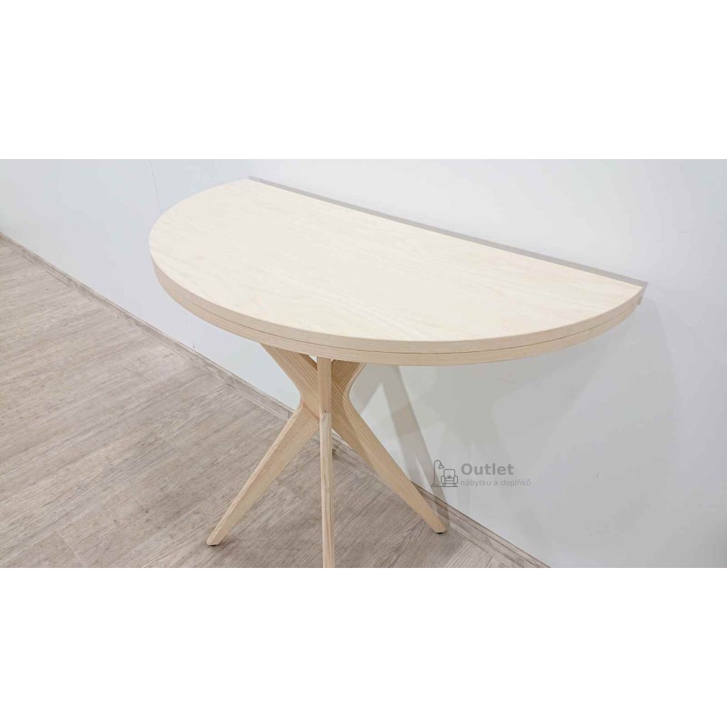 Stůl, který se skvěle hodí do menších bytů. Pokud ho složíte, je do tvaru půlkruhu a nají se u něj 1 - 2 osoby. Když stůl rozložíte, dostanete kruhovou desku, u které můžou stolovat 2 - 3 osoby. Nožky mají zespodu šroubovací kluzáky, díky kterým snadno doladíte nerovnosti podlahy.