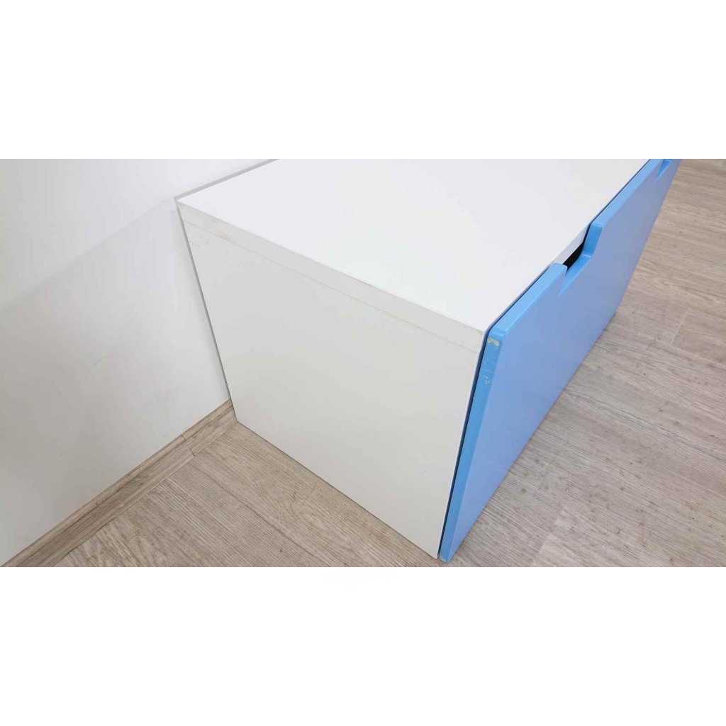 Truhla do dětského pokoje na hračky. Díky kolečkům se dětem snadno vysouvá. Vrchní část slouží jako lavice.