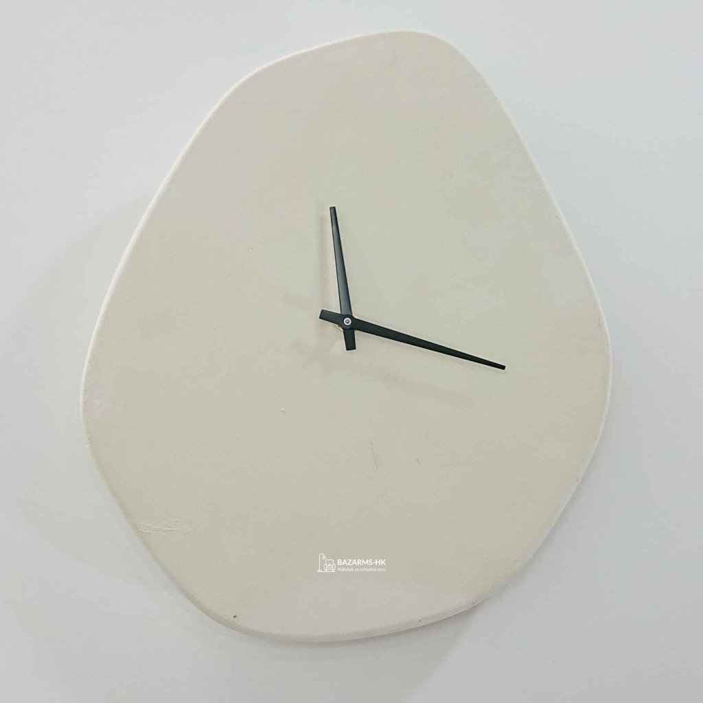 Bílé designové hodiny z cementu v nepravidelném tvaru.