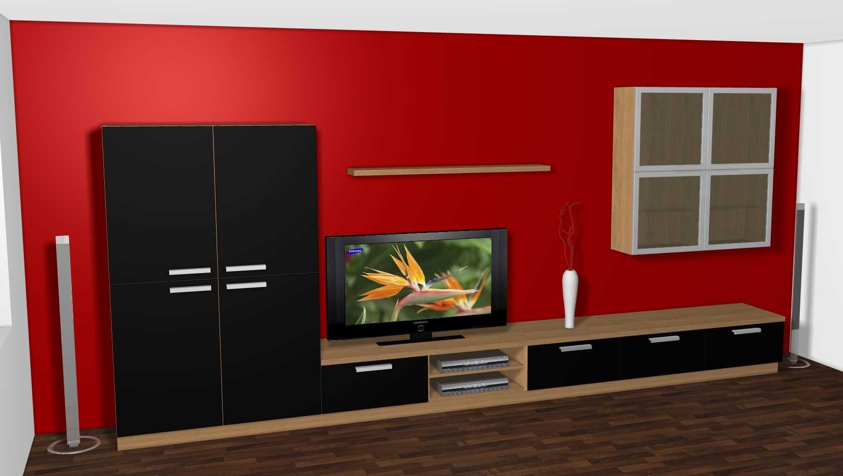 Obývací stěna, kterou si představujeme, se skládá z několika kusů. Na pravé straně stojí dvoukřídlá skříňka s hliníkovými rámečky. Tato skříňka je ideální pro uskladnění větších věcí, jako jsou knihy, hry nebo dekorace. Na levé straně stojí středně vysoká dvoukřídlá skříň s policemi, která slouží jako úložný prostor pro menší předměty. Tyto dvě skříně jsou vyrobeny z laminační desky v dekoru dřeva a mají černá dvířka. Důležité je, že jsou dvířka opatřena panty s tlumením, což minimalizuje hluk a zabraňuje nárazům.
