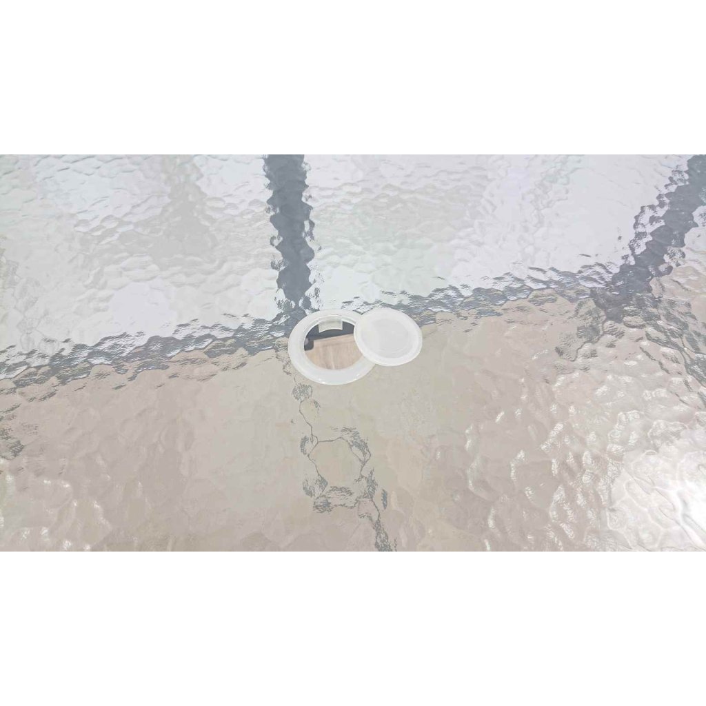 Stůl je dostatečně prostorný, vhodný pro 6 osob. Uprostřed desky je otvor (schovaný krytkou), kam můžete umístit slunečník - otvor pro slunečník průměr 42 mm.
