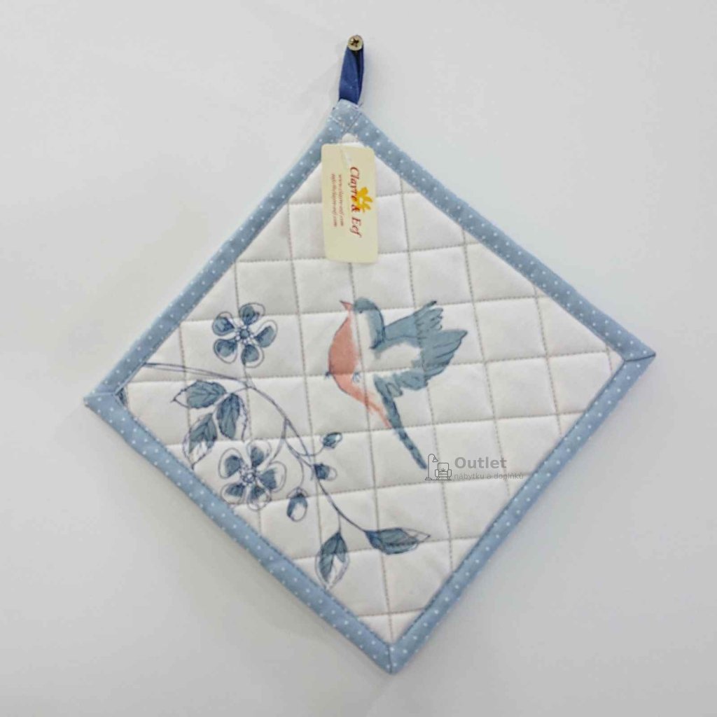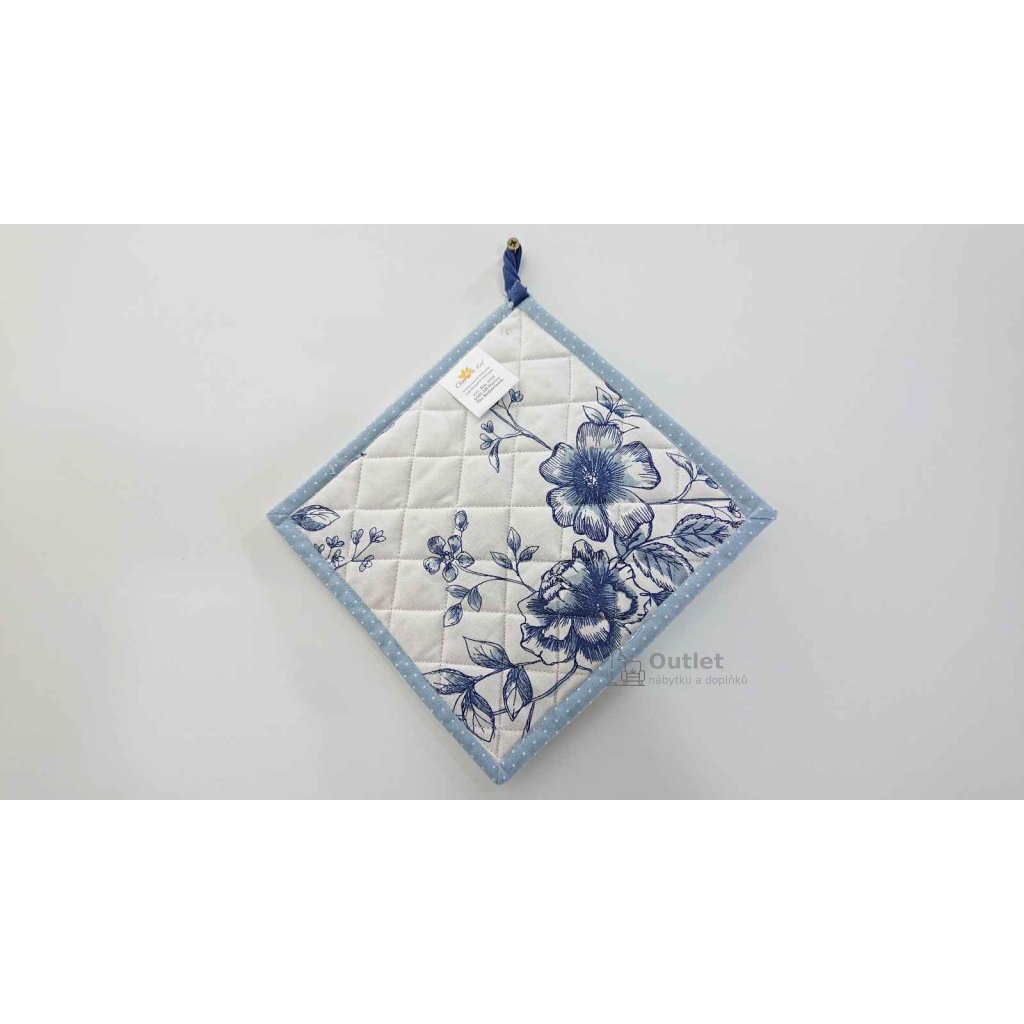 Krásná textilní podložka pod hrnec nebo pod konvici s motivem ptáčka v kombinaci bílé a modré barvy. Má praktické poutko, díky kterému můžete podložku zavěsit na háček.