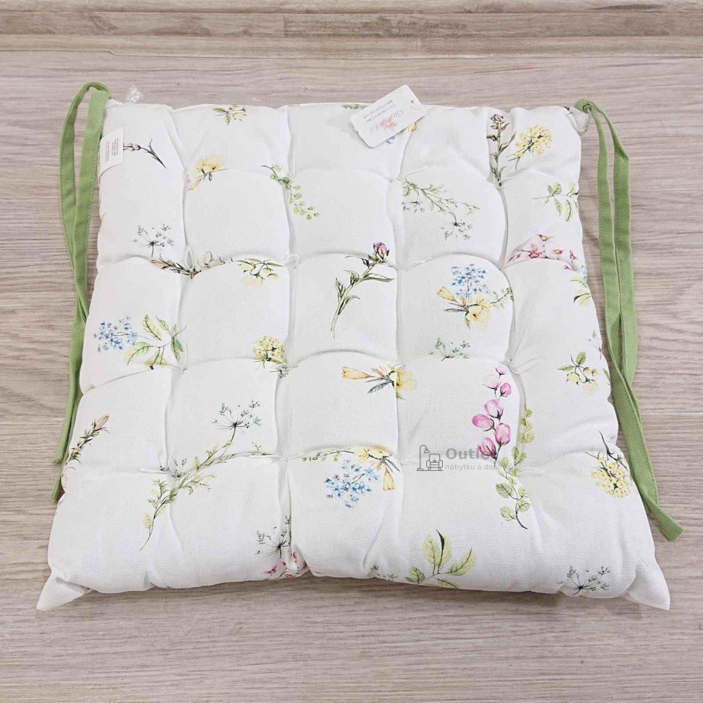 Měkoučký podsedák, který vám zpříjemní posezení na židli nebo lavici. Je s jemnými motivy květin a doplněn je o zelené šňůrky k uvázání. jasná volba do romantických interiérů nebo na chatu či chalupu.