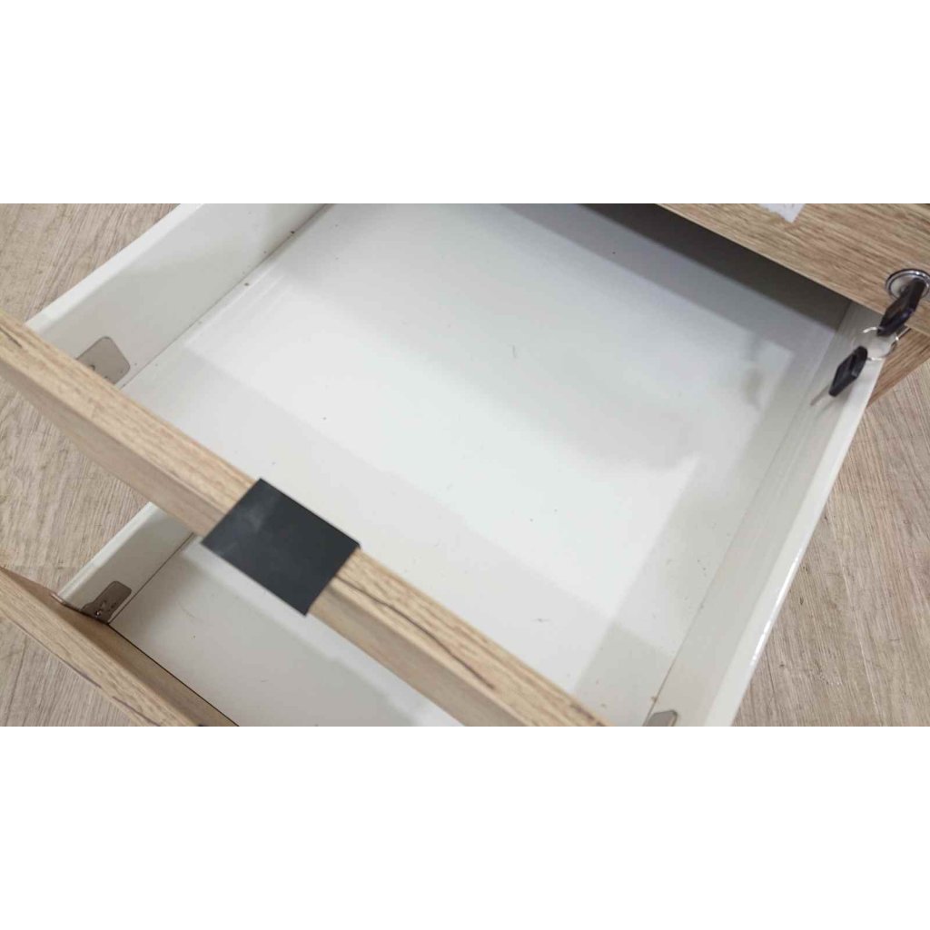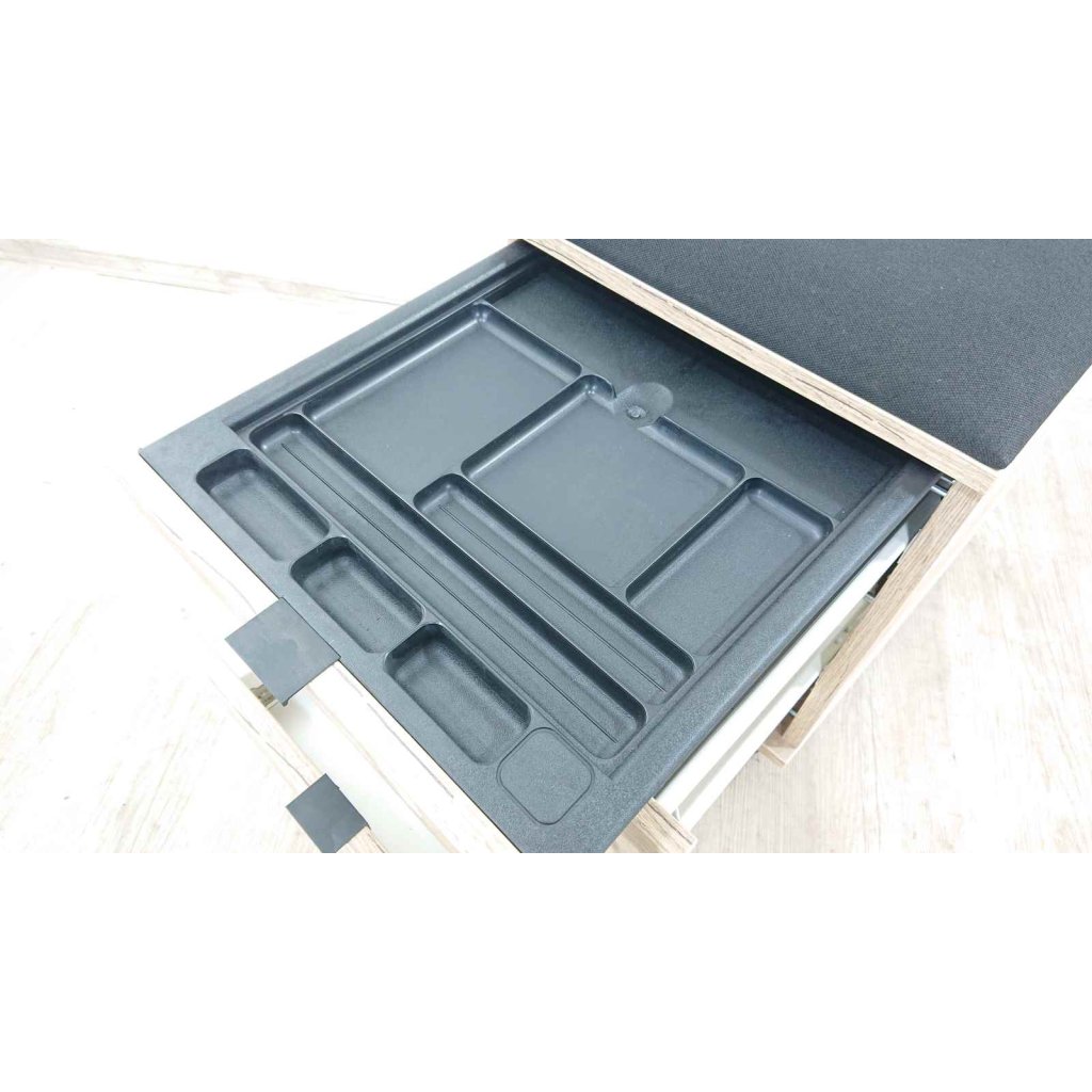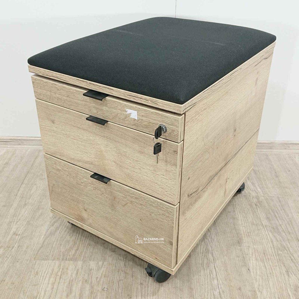 Kontejner ke kancelářskému stolu na kolečkách, který je možné zabrzdit. Součástí jsou 3 zásuvky, v té vrchní jsou členěné přihrádky na psací potřeby. Vrchní deska je čalouněná. Klíčem se zamknou první a druhá zásuvka.