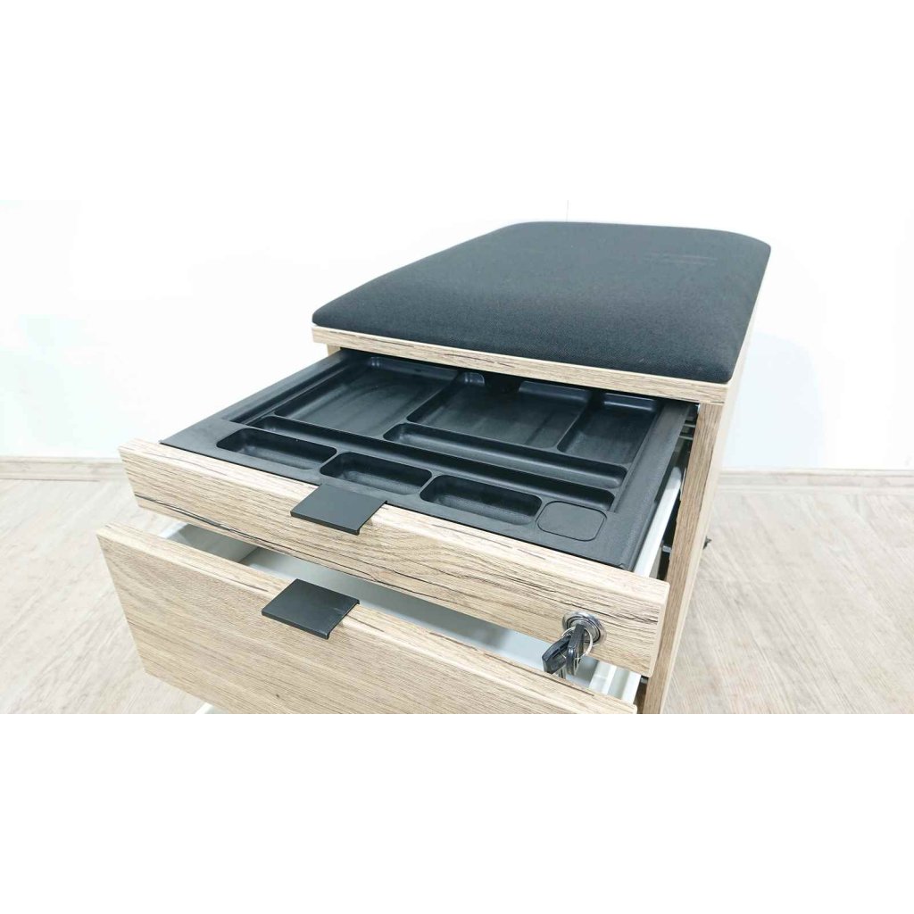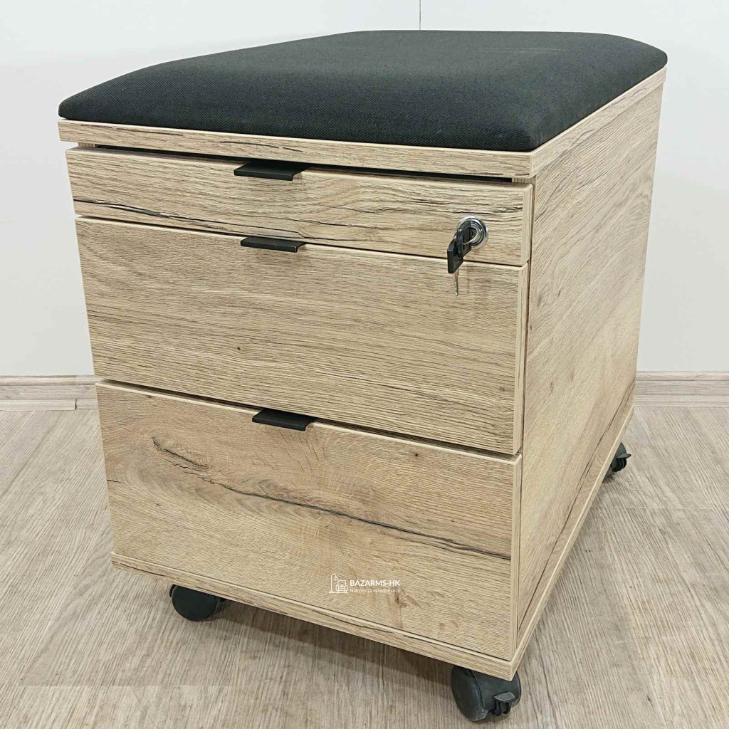 Kontejner ke kancelářskému stolu na kolečkách, který je možné zabrzdit. Součástí jsou 3 zásuvky, v té vrchní jsou členěné přihrádky na psací potřeby. Vrchní deska je čalouněná. Klíčem se zamknou všechny zásuvky.