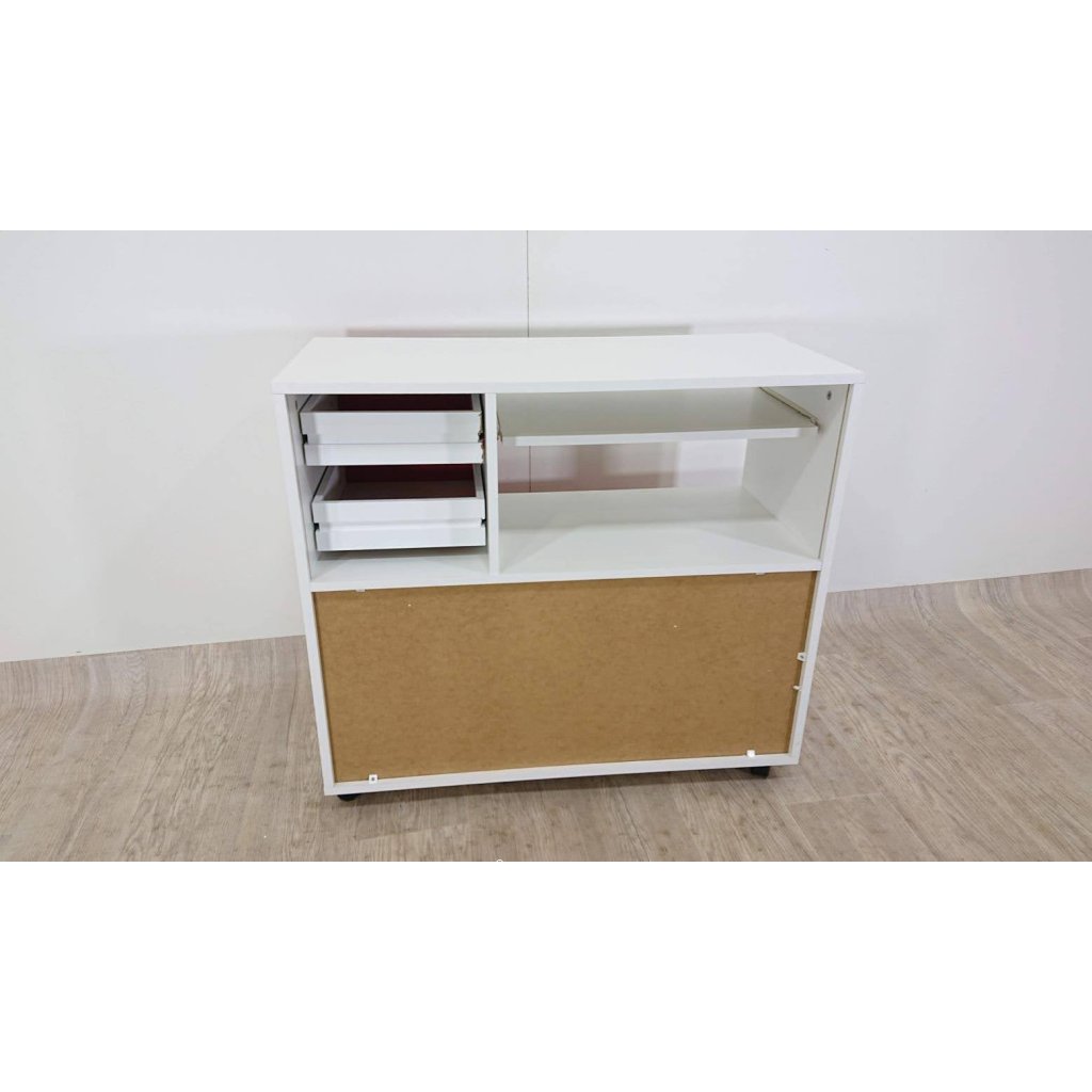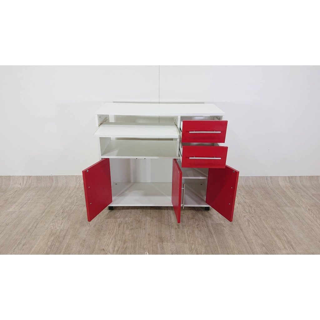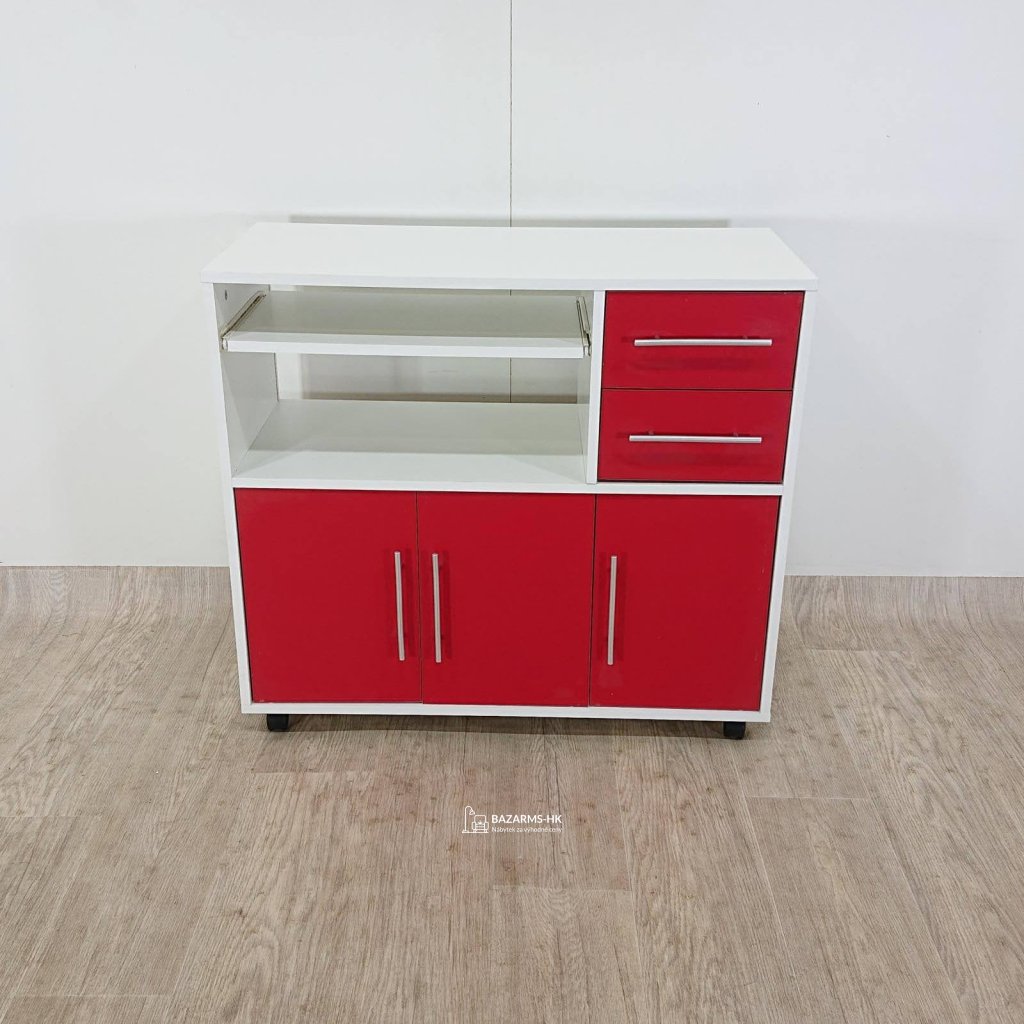 Výrazná komoda s dostatkem úložného i odkládacího prostoru, s výsuvnou deskou, na kolečkách.