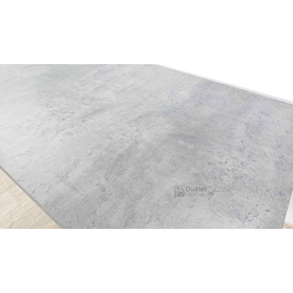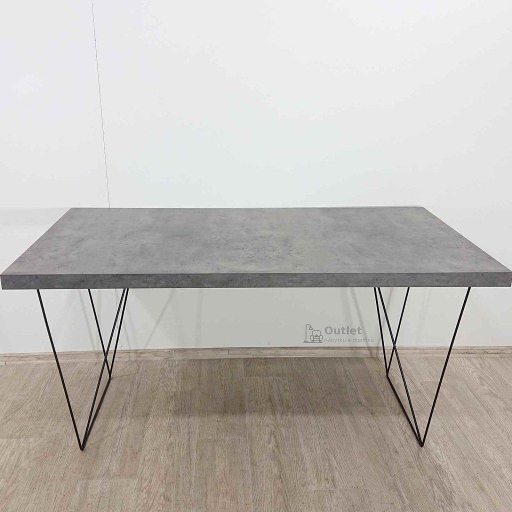 Jednoduchý pracovní stůl s deskou v dekoru betonu a tenkým kovovým podnožím.