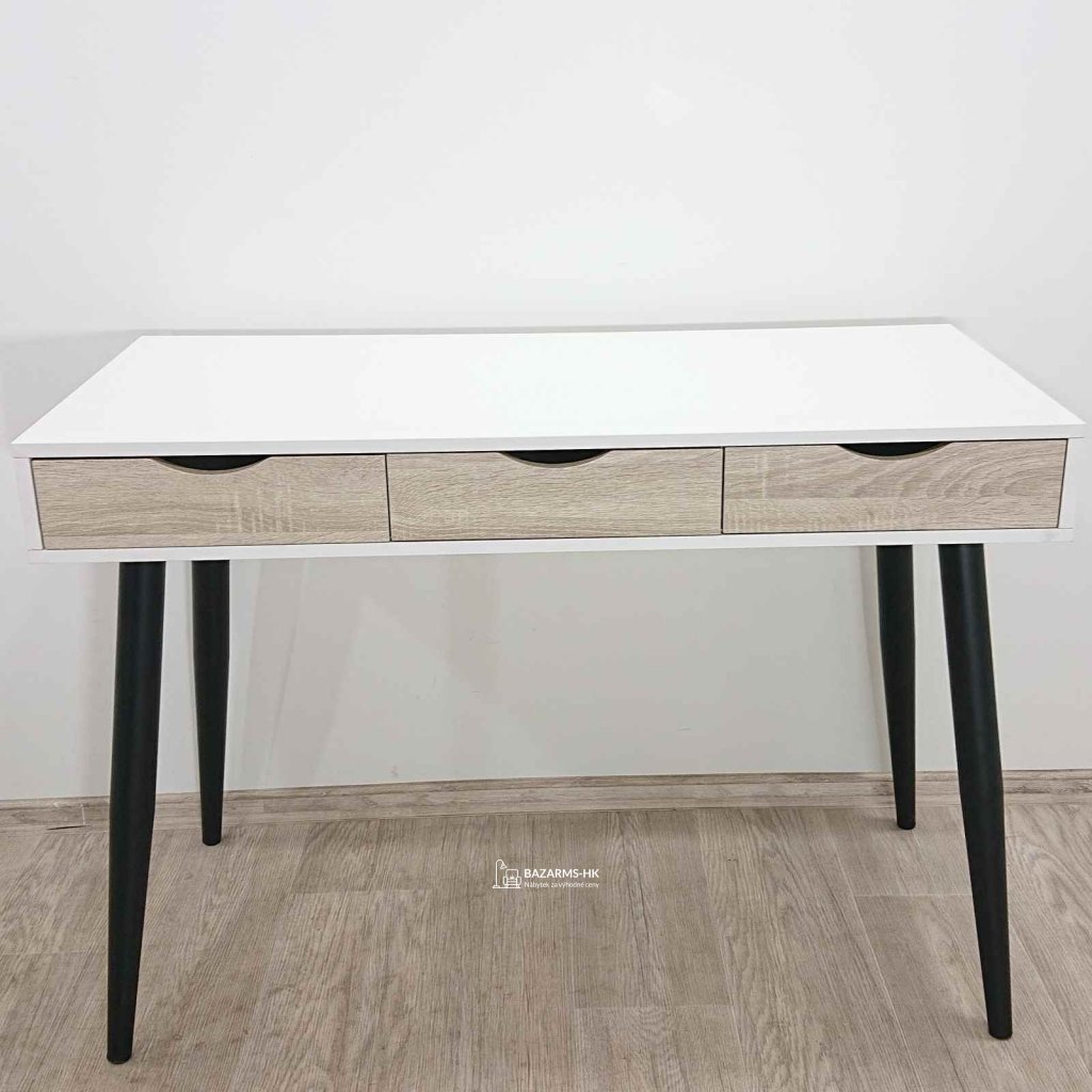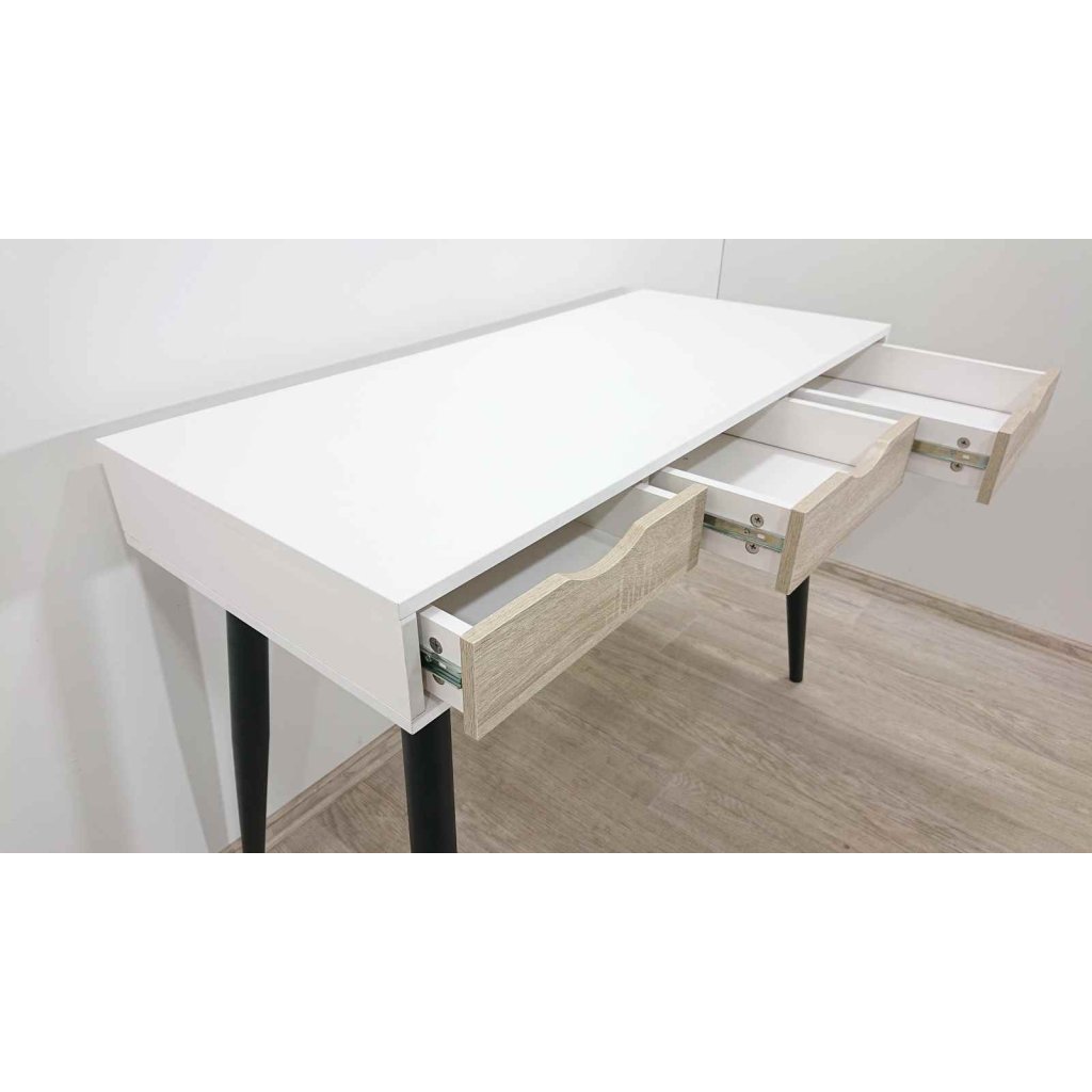 Bílý psací stůl se 3 zásuvkami v dekoru dřeva na uložení dokumentů a psacích potřeb. Stůl můžete využít i jako toaletku v ložnici. Tento bílý pracovní stůl je vhodný do moderního i skandi stylu bydlení. Pracovní stůl je poměrně těžký a bytelný.
