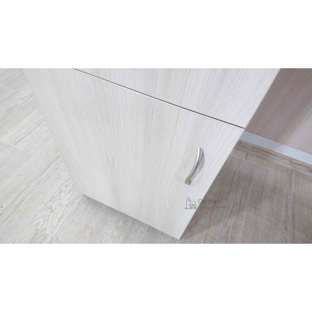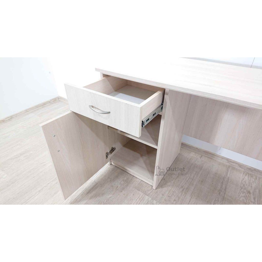 Pracovní stůl ve světlém dekoru dřeva s praktickou zásuvkou a skříňkou s poličkou.