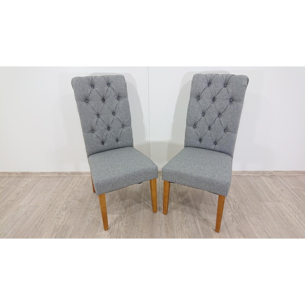 Šedé jídelní v elegantím provedení s opěrkami ve stylu Chesterfield a s kovovou ozdobou na zadní straně.