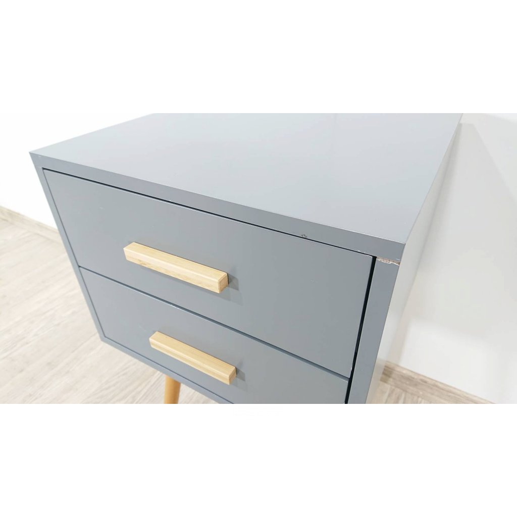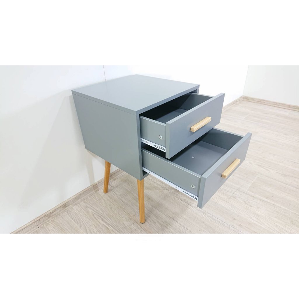 Šedý noční stolek se 2 zásuvkami, který se bude hodit do moderních i seversky laděných ložnic. Šuplíky budou sloužit k uložení brýlí, krémů i knížek a vše tak budete mít při ruce, ale zároveň schované. Kombinace šedé barvy a dřeva působí útulným dojmem.