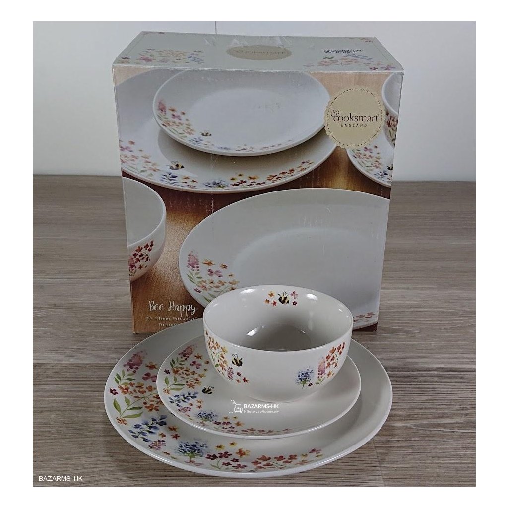 12dílný set nádobí z porcelánu Cooksmart England Bee Happy. Veselá sada nádobí, která rozzáří Vaše stolování. 3x talíř: Ø 26,5 cm, 2x dezertní talíř: Ø 19 cm, 4x miska: Ø 14 cm, vhodné do myčky a mikrovlnky.