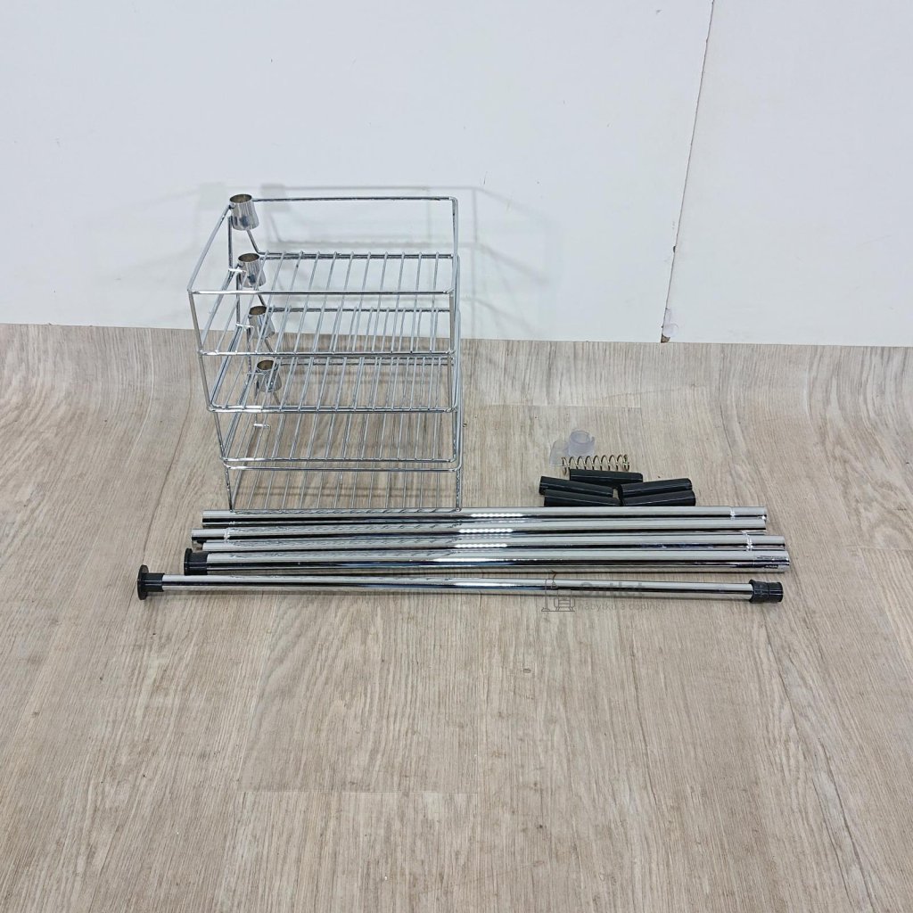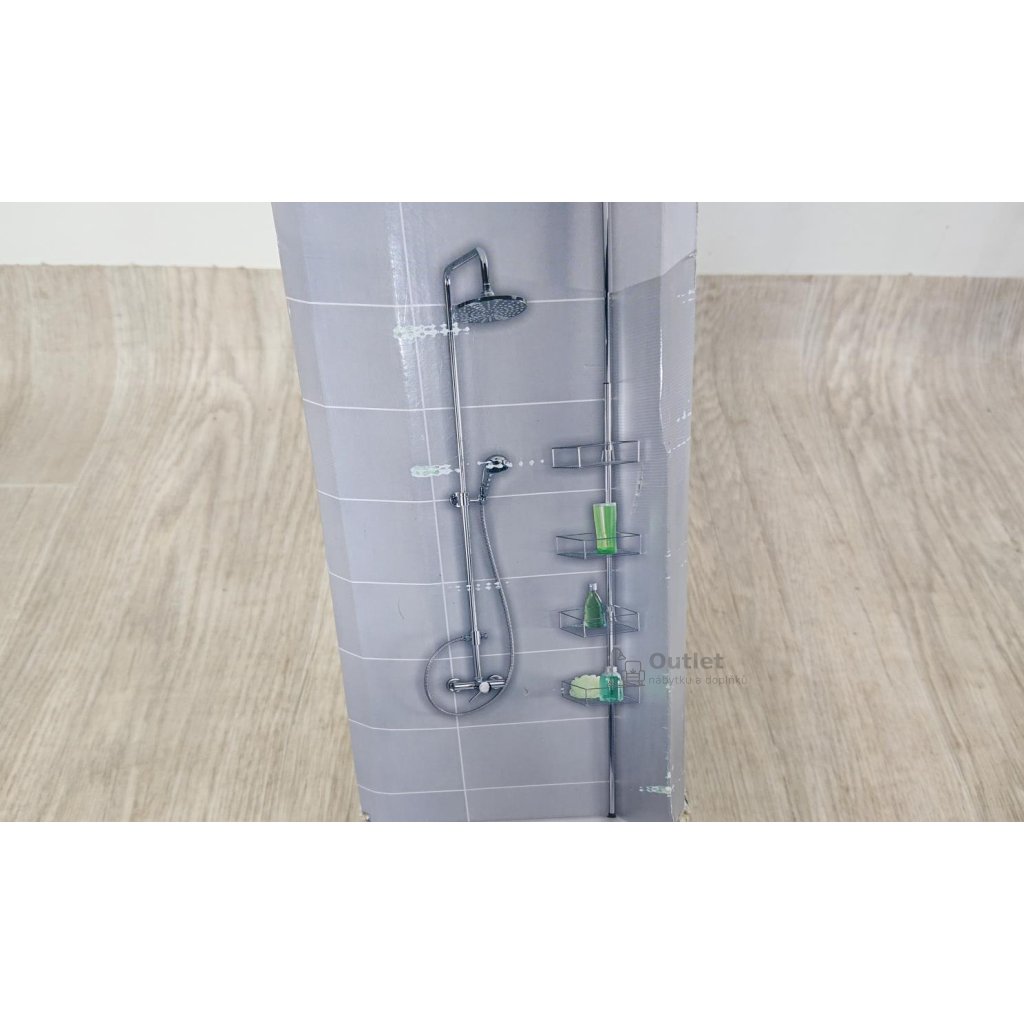 Nástěnná police s košíky vhodná do koupelny, která nabízí výškovou nastavitelnost.