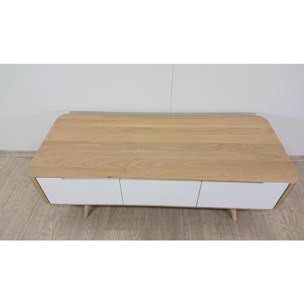 Materiál: masivní dřevo dub - ošetřeno přírodním olejem, čela zásuvek a sklopných dvířek MDF deska - bílá lakovaná.