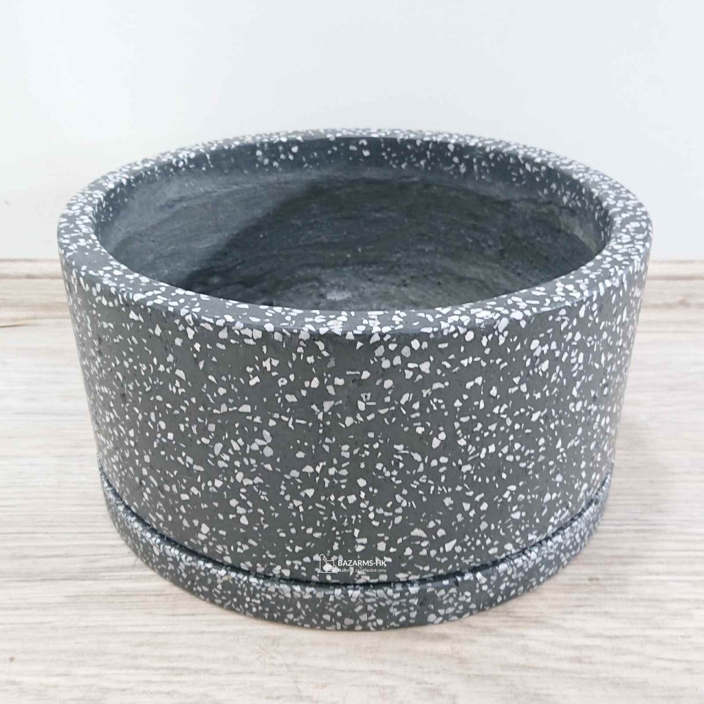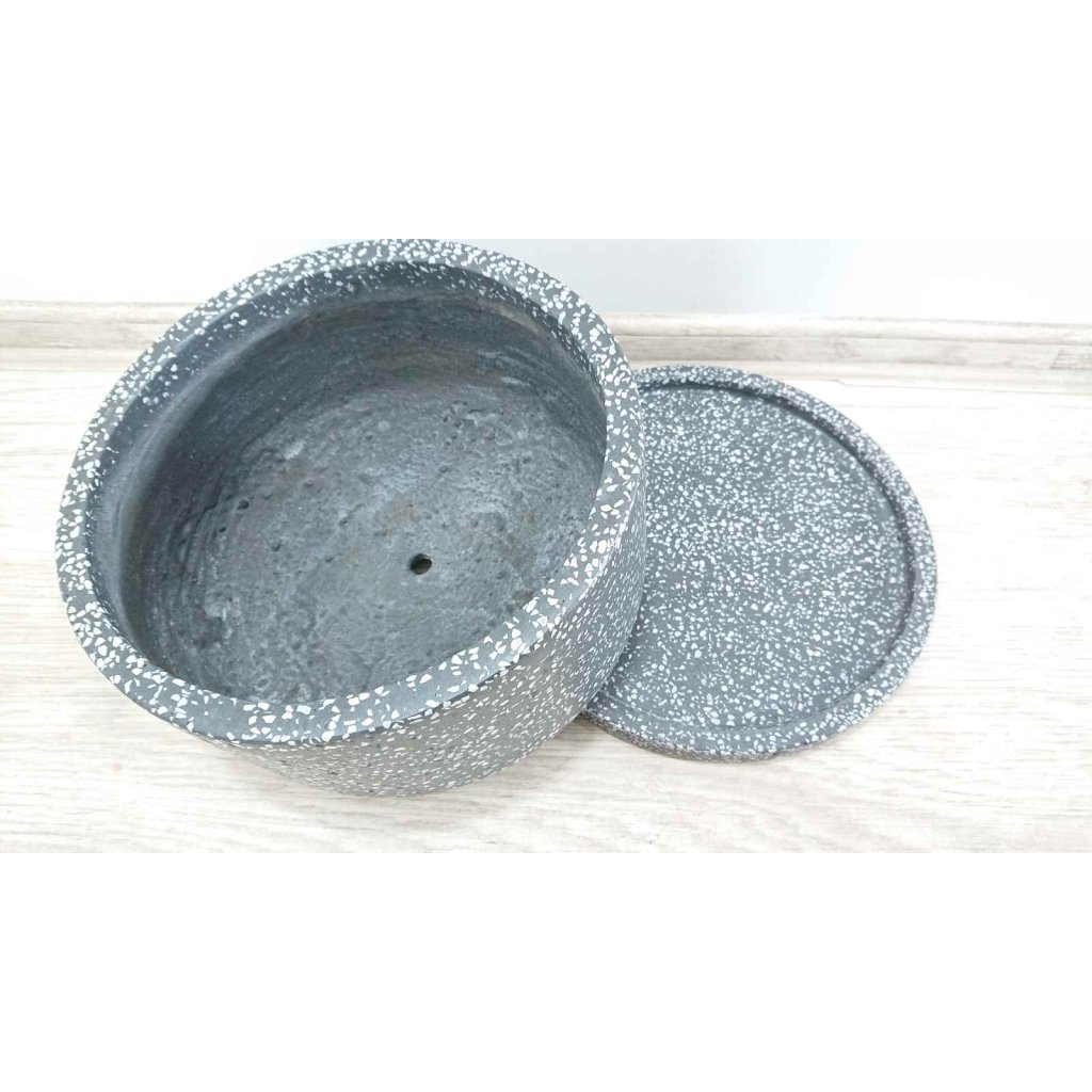 Těžký betonový květináč s odtokovým otvorem a miskou v tmavě šedé barvě vhodné do interiéru i exteriéru.