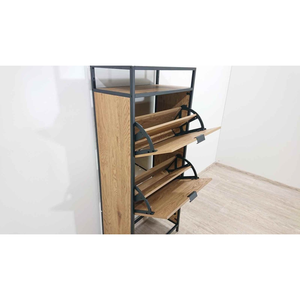 Designový botník s kovovou konstrukcí pro uložení bot a také s poličkami na doplňky nebo na klíče. Černá konstrukce a dubový dekor podtrhují moderní vzhled. Hloubka 30 cm umožní umístit tento botník i do úzké chodbičky, kde nezabere příliš místa.
