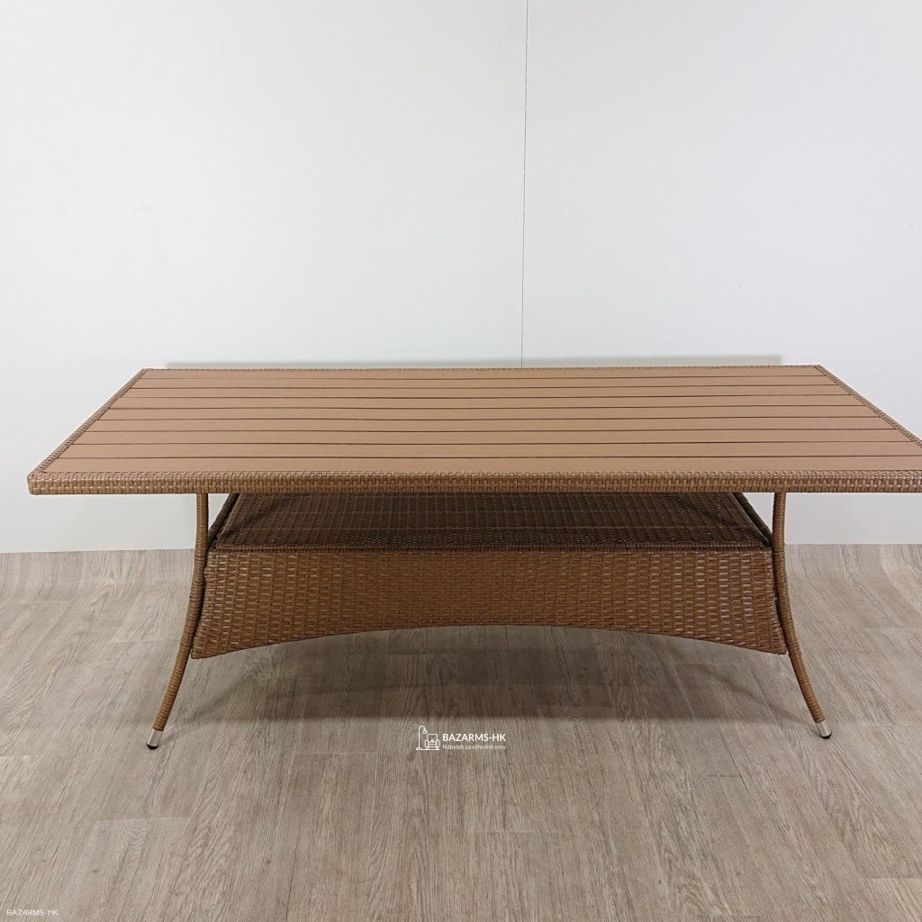 Prostorný zahradní stůl, stabilní díky široké základně. Vespod je praktická odkládací plocha. Stůl je vhodný až pro 8 osob. 200 × 96 × 74 cm (šířka x hloubka x výška), materiál ocelová konstrukce/umělý ratan/artwood deska.